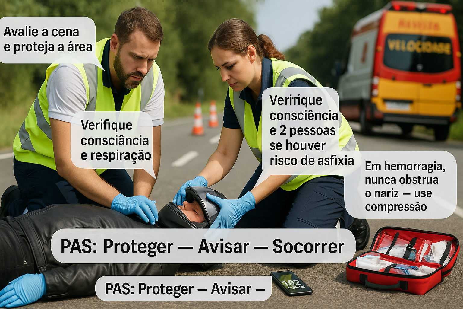- Se o motociclista estiver inconsciente e houver risco de asfixia, remova o capacete com cuidado (entre duas pessoas, se necessário) para evitar danos adicionais, e, em caso de hemorragia, nunca obstrua o nariz.