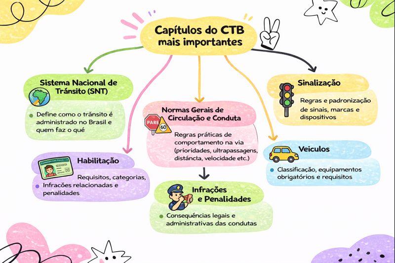 O CTB é estruturado em capítulos que organizam o conteúdo por tema. Isso facilita estudar e localizar assuntos, porque cada parte trata de um conjunto específico de regras e responsabilidades.