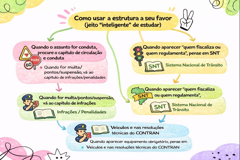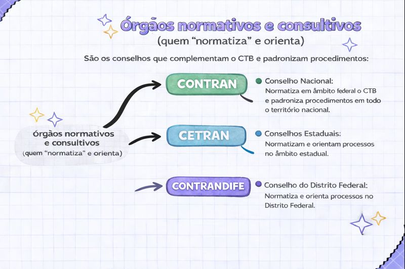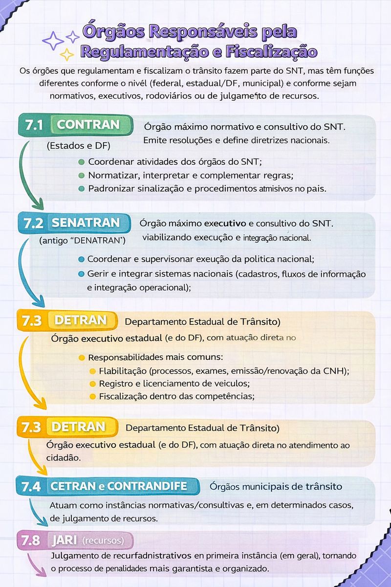 - Importante para prova e para estudo: em materiais mais antigos, você pode ver “DENATRAN”. A estrutura foi atualizada e o nome mais atual usado é SENATRAN. Então, se a questão misturar os termos, pense assim: DENATRAN (antigo) → SENATRAN (atual).