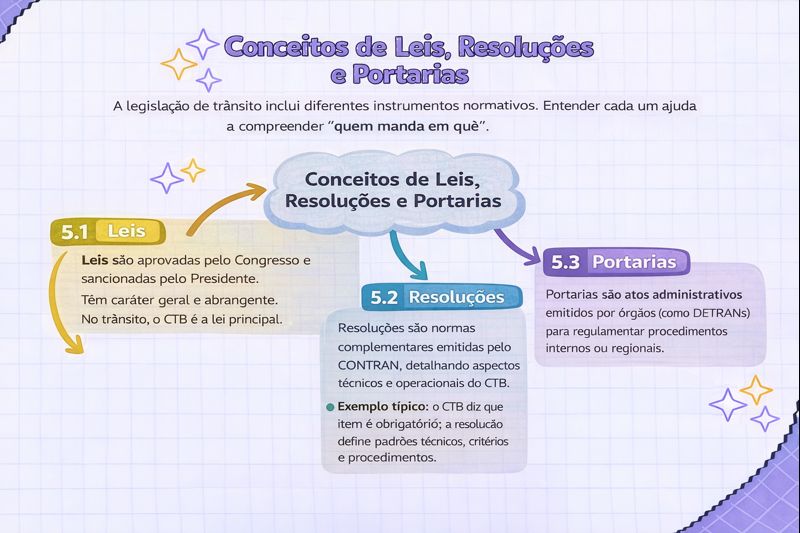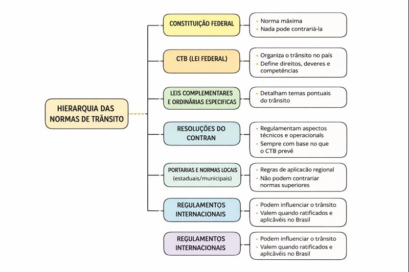 - CTB (Lei Federal): organiza o trânsito no país e define direitos, deveres e competências.