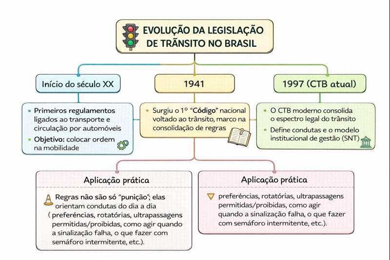A legislação de trânsito nasceu e evoluiu porque a sociedade precisou criar normas acordadas para orientar o uso do espaço público e dar respaldo legal às ações de fiscalização, educação e engenharia de tráfego.