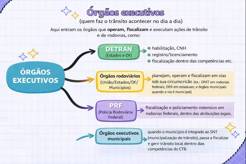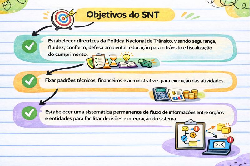 - Sistema Nacional de Trânsito (SNT): define como o trânsito é administrado no Brasil e quem faz o quê.