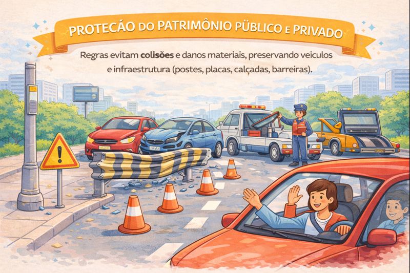 Regras evitam colisões e danos materiais, preservando veículos e infraestrutura (postes, placas, calçadas, barreiras).