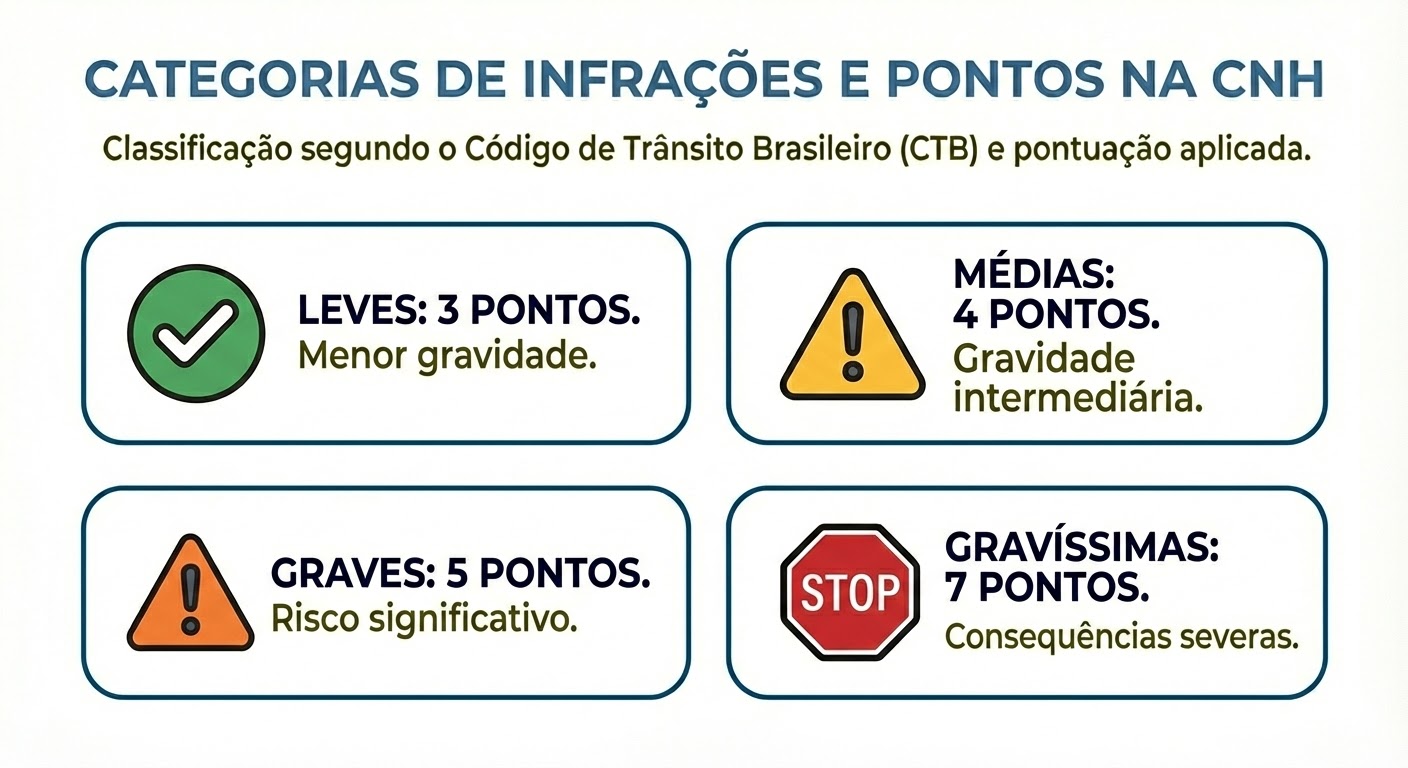 - Multas e Sanções Financeiras: Além da perda de pontos, cada infração também gera penalidades financeiras, que podem variar conforme a gravidade da infração.