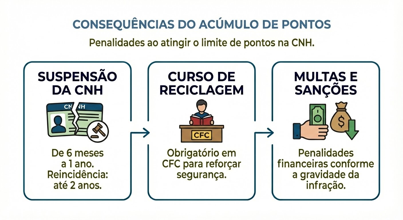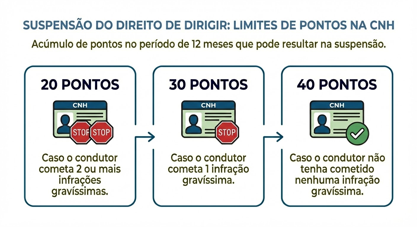 - 20 pontos: Caso o condutor cometa 2 ou mais infrações gravíssimas no período de 12 meses.