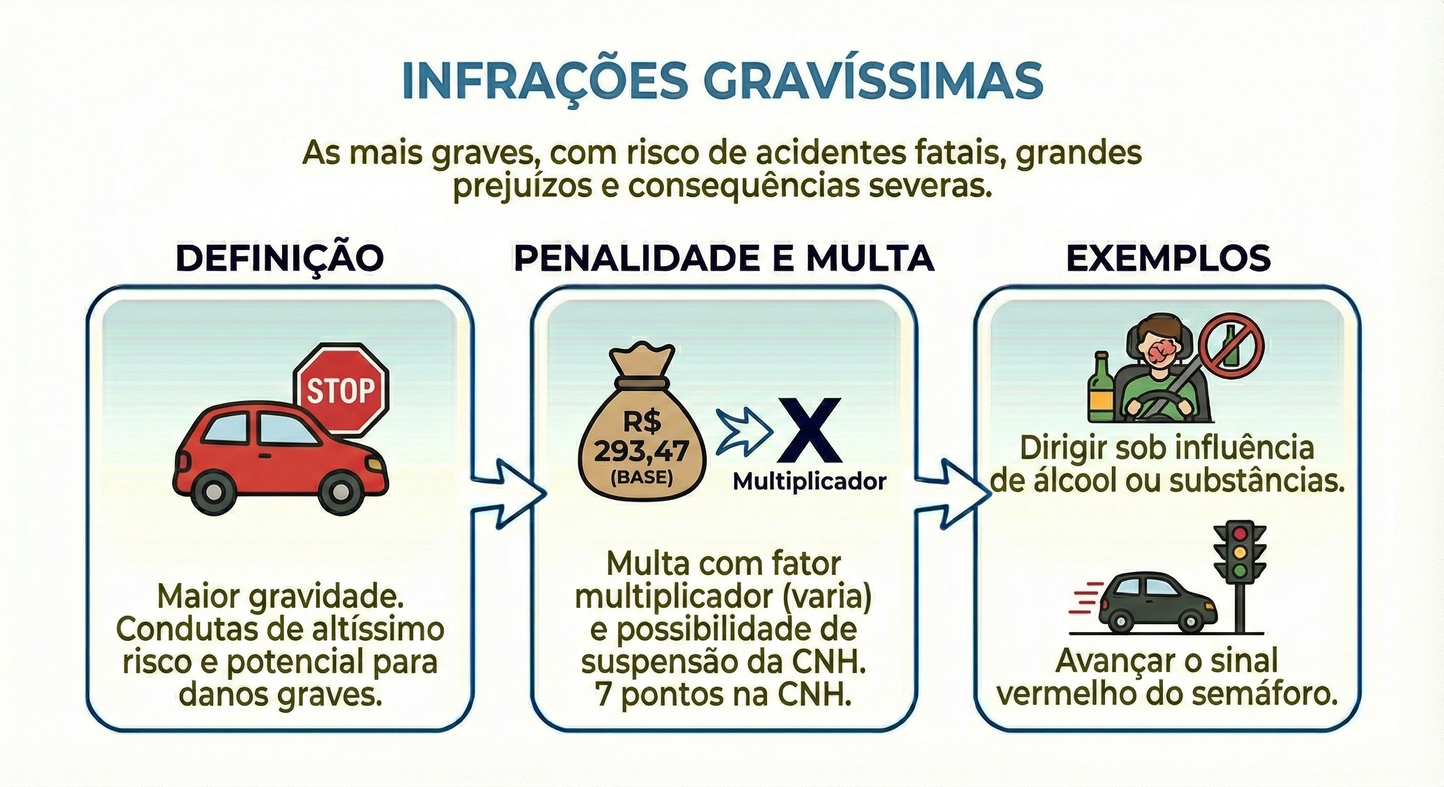 - Penalidade: multa com fator multiplicador (varia de acordo com a infração) e possibilidade de suspensão da CNH.