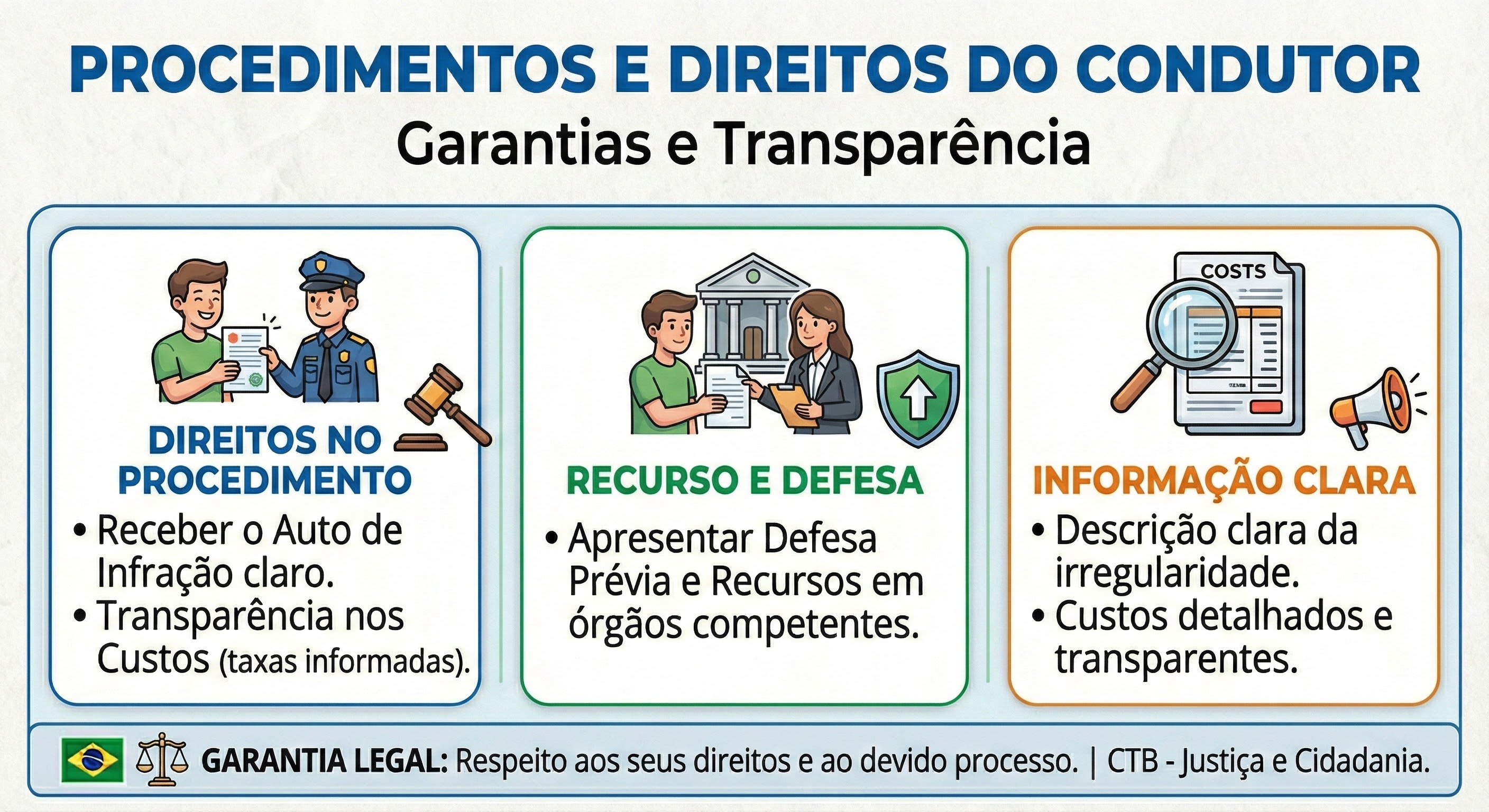 O condutor tem direitos garantidos durante os procedimentos de apreensão, remoção e retenção. Entre eles: