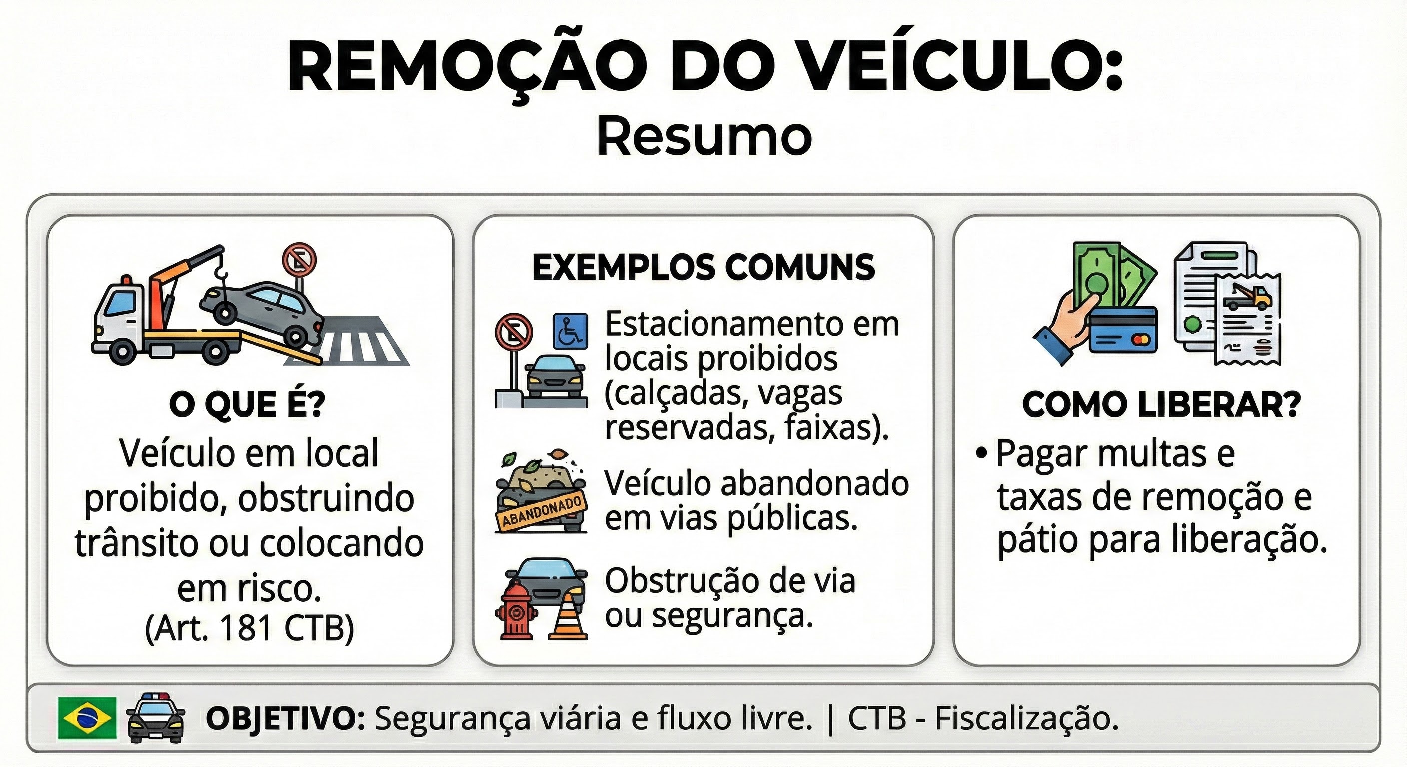 A remoção ocorre quando o veículo está estacionado de forma irregular, obstruindo o trânsito ou colocando em risco a segurança de outros condutores e pedestres. Exemplos incluem: