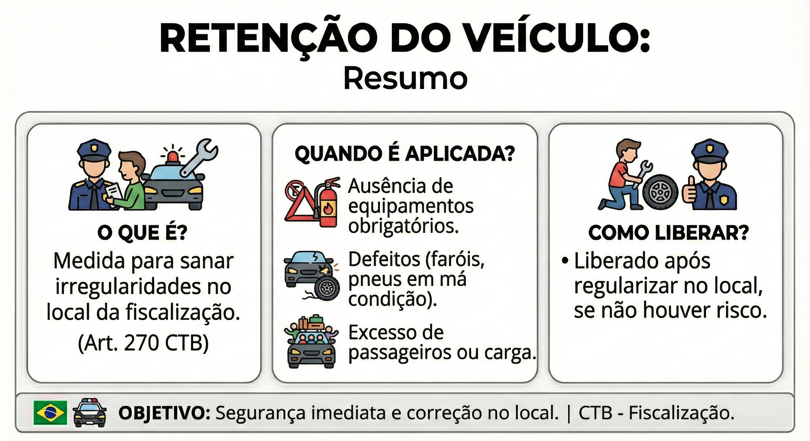 A retenção do veículo é uma medida menos severa, aplicada para sanar irregularidades que possam ser resolvidas no local da fiscalização.