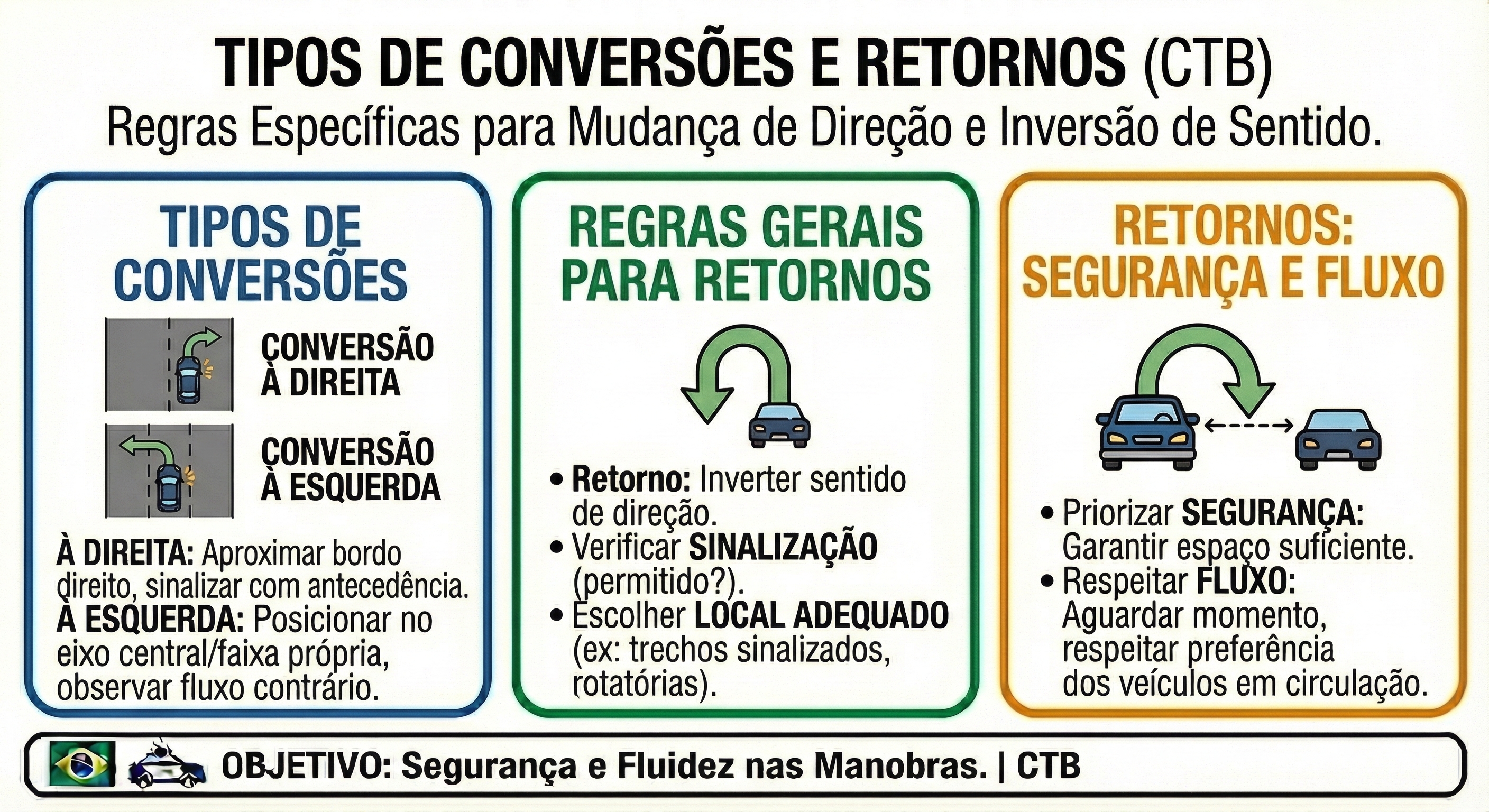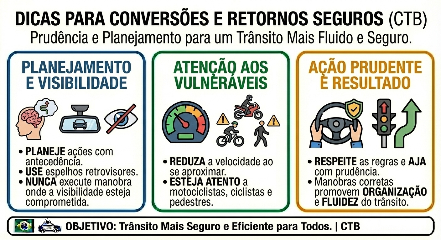 As conversões e retornos são manobras essenciais no trânsito, realizadas para mudar a direção do veículo ou retornar ao sentido oposto de uma via.
