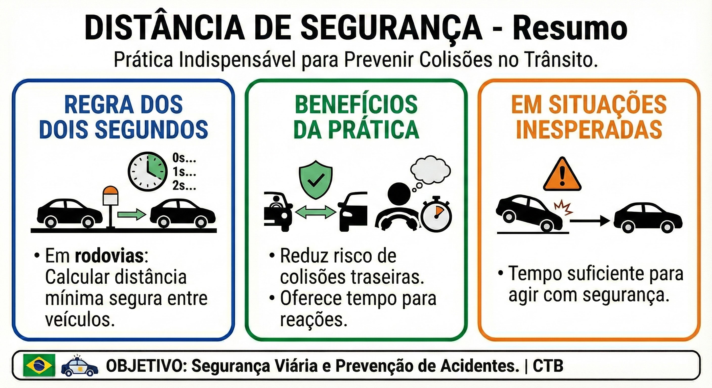 Essa distância permite reações adequadas em caso de freadas bruscas ou emergências, reduzindo o risco de colisões traseiras.