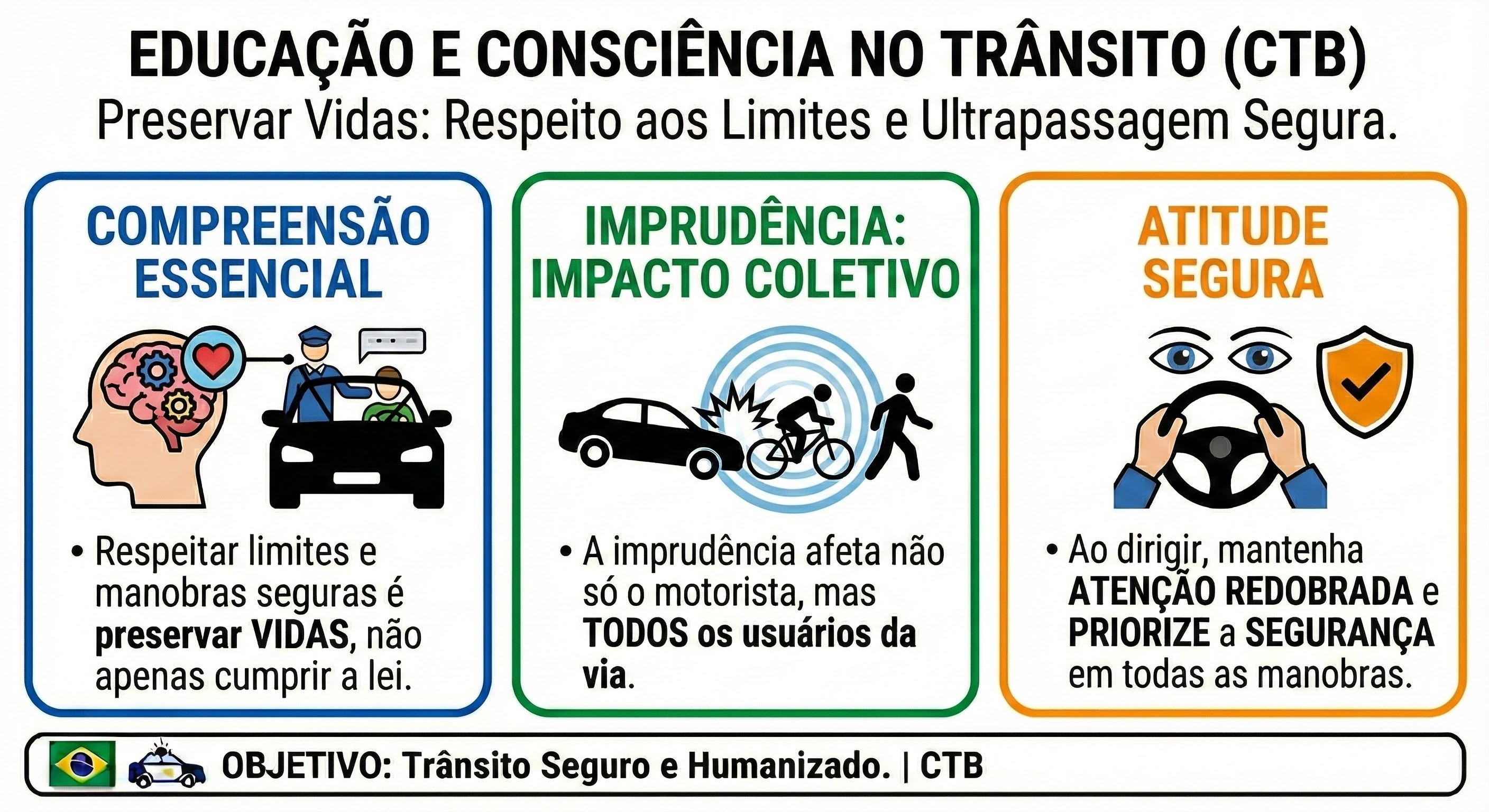 A educação para o trânsito deve enfatizar a importância dessas práticas, orientando os futuros condutores a adotarem comportamentos que priorizem a segurança coletiva.