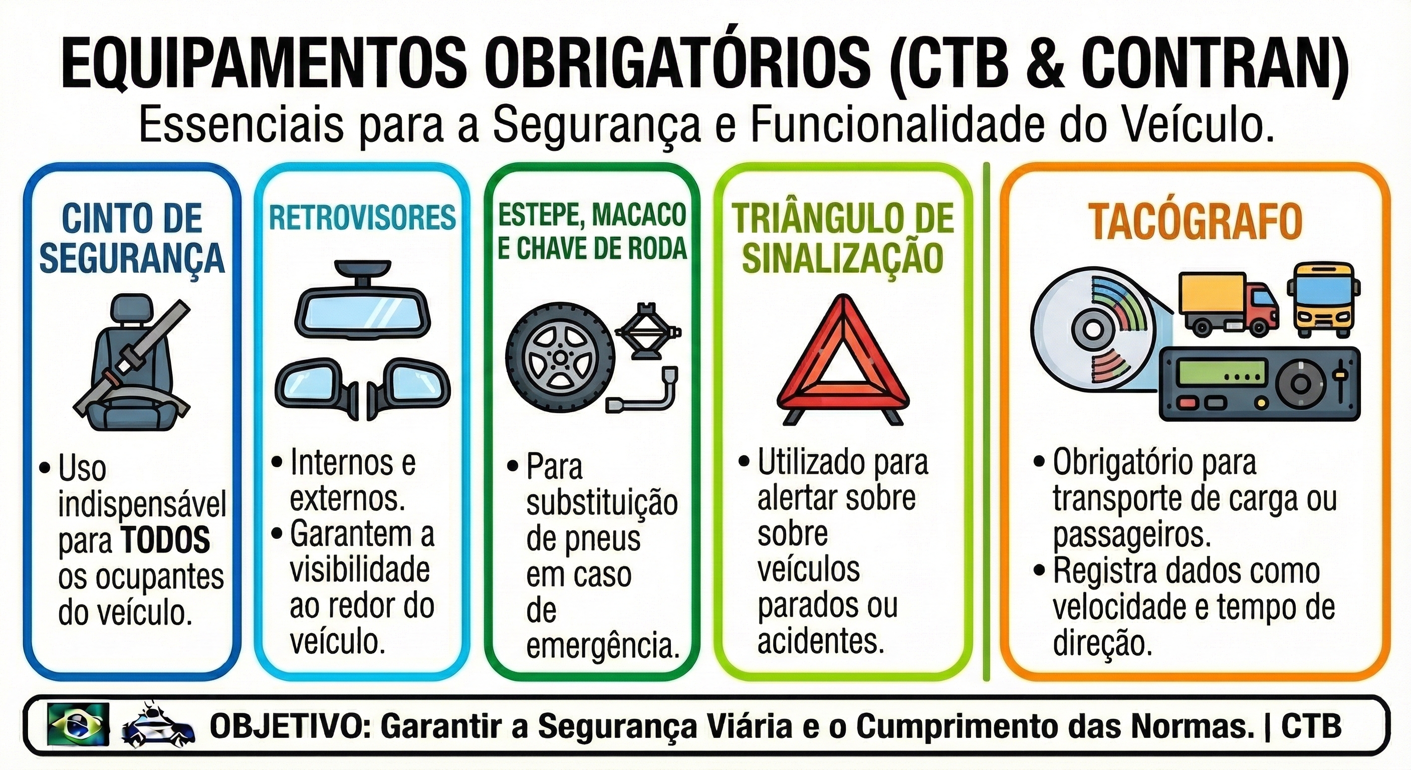 Os equipamentos obrigatórios variam conforme o tipo de veículo, mas incluem itens essenciais para a segurança e a funcionalidade do veículo. Entre eles estão: