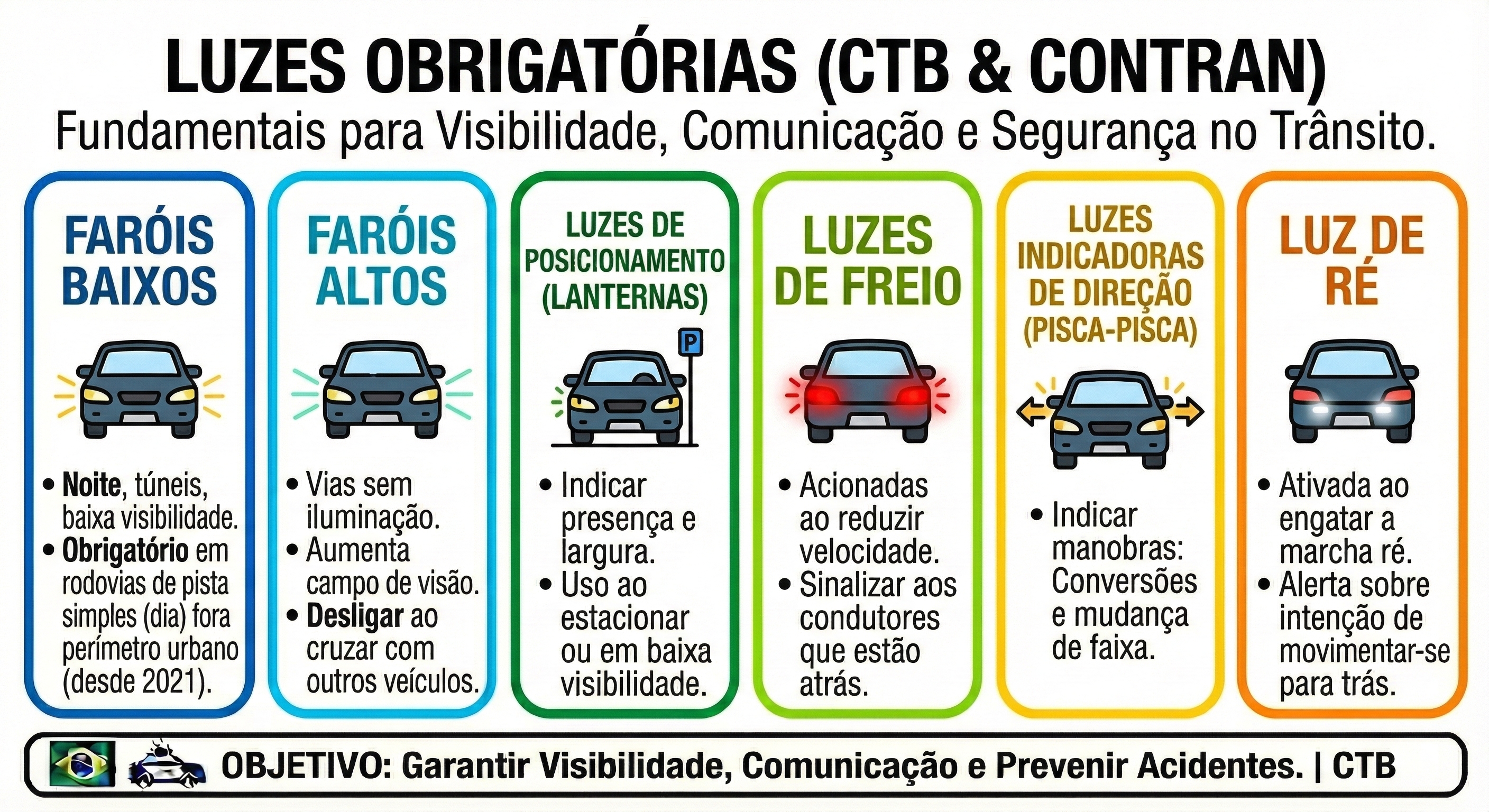 - Faróis Baixos: Devem ser utilizados durante a noite, em túneis, e em qualquer condição de baixa visibilidade. Desde 2021, é obrigatório o uso dos faróis baixos também durante o dia em rodovias de pista simples fora do perímetro urbano.