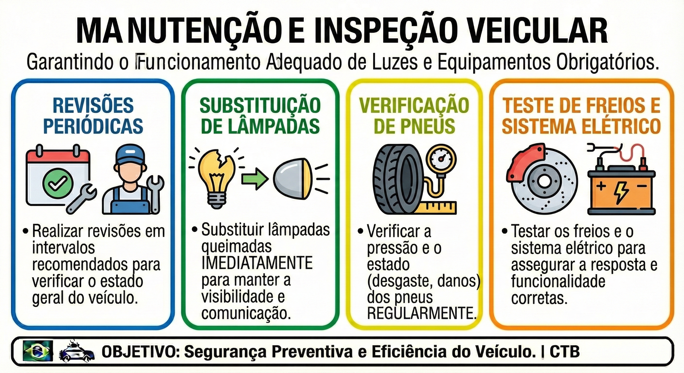 Para garantir o funcionamento adequado das luzes e dos equipamentos obrigatórios, recomenda-se: