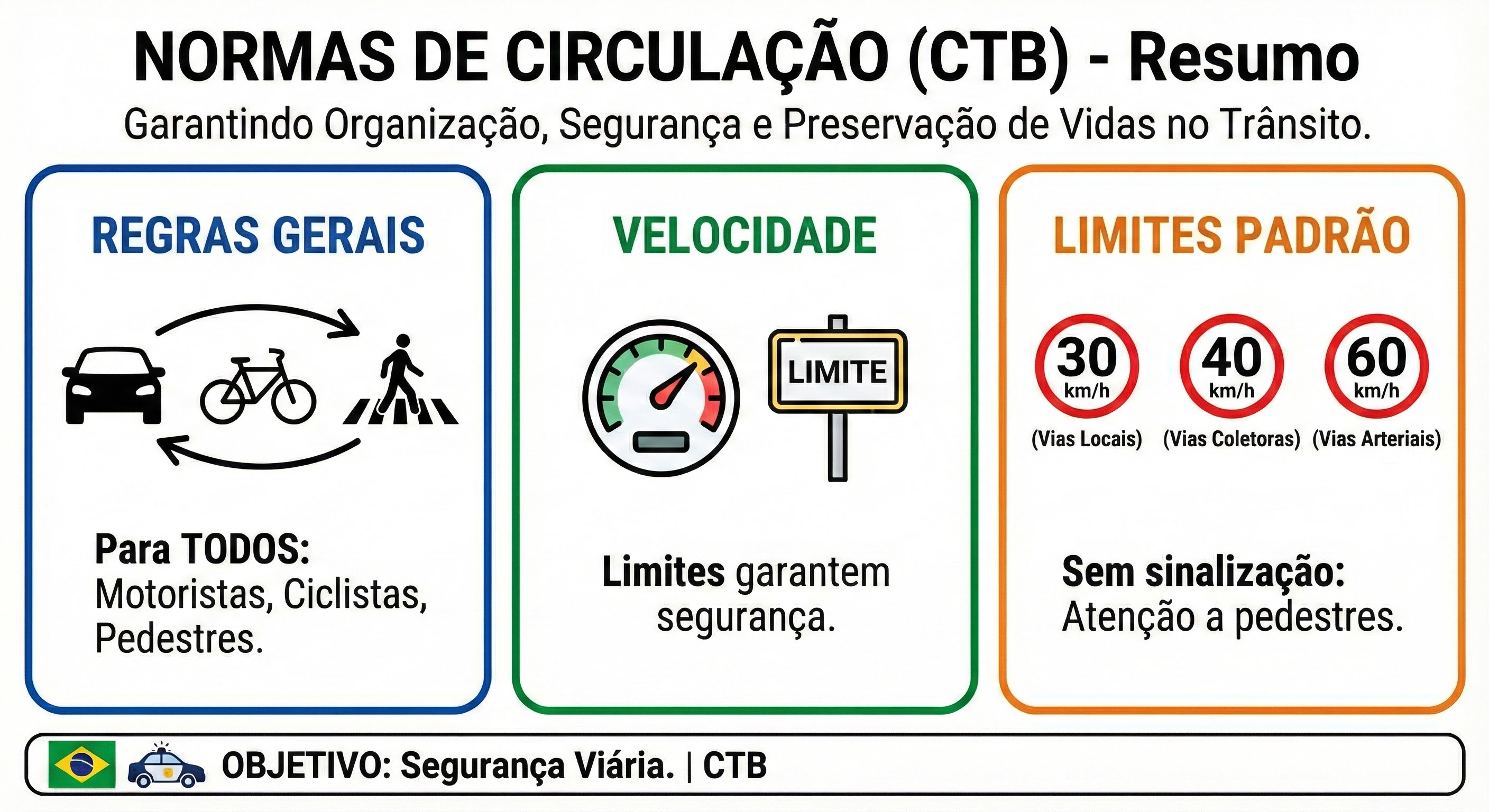 O CTB define que, na ausência de sinalização, aplica-se o limite padrão de 30 km/h em vias locais, 40 km/h em vias coletoras e 60 km/h em vias arteriais.