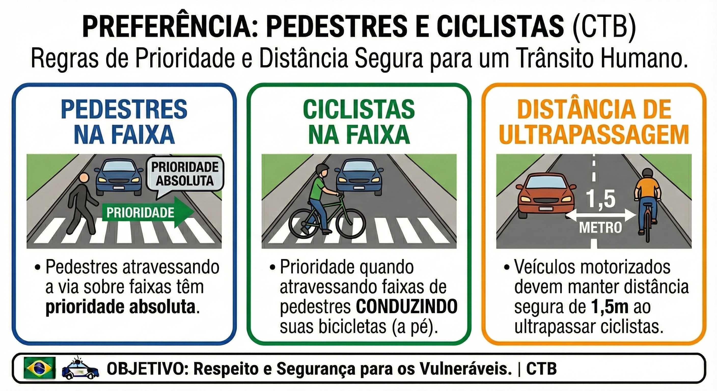 - Veículos motorizados devem manter uma distância segura de 1,5 metro ao ultrapassar ciclistas.