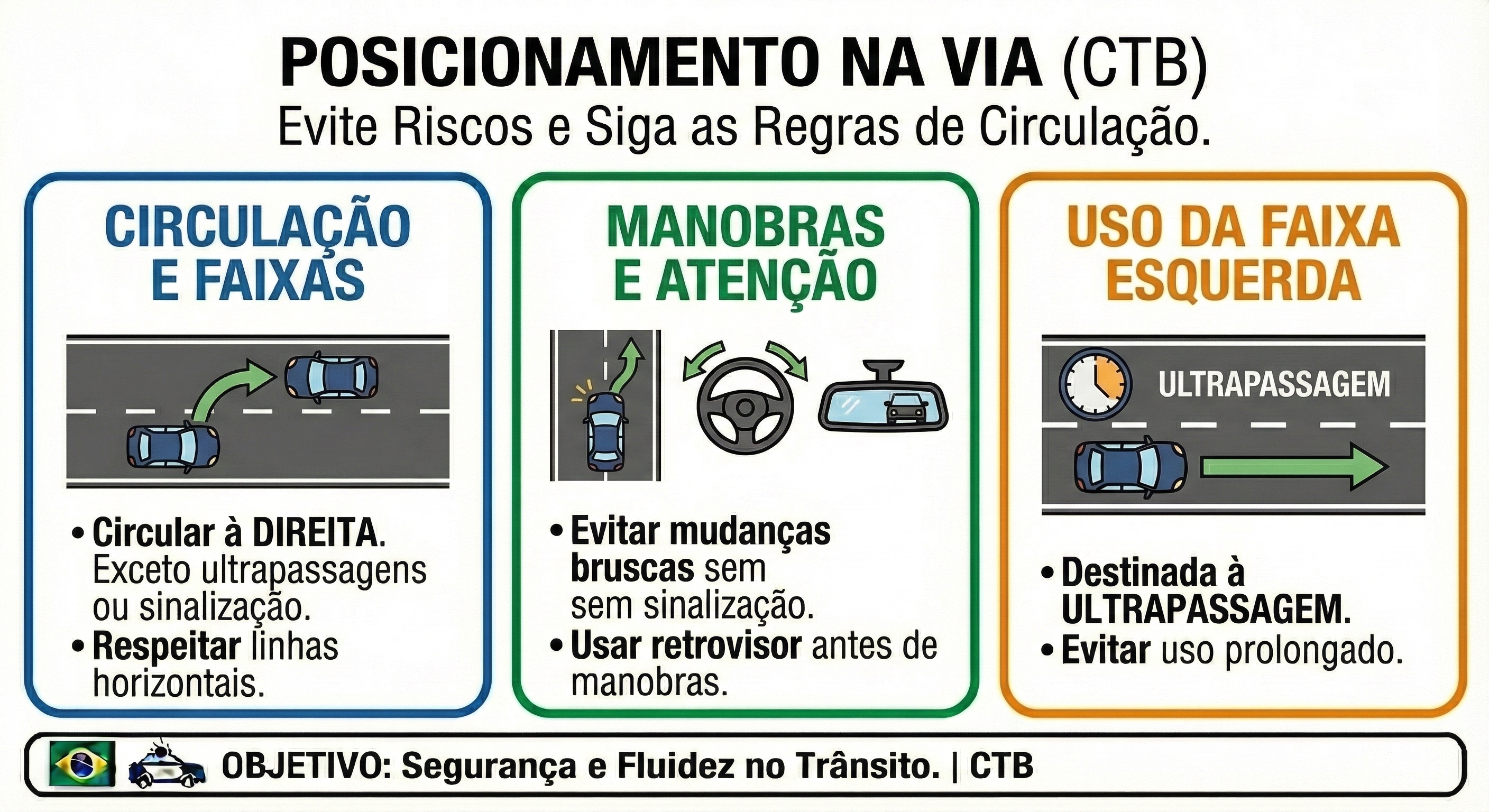 O posicionamento adequado na via também é crucial para evitar situações de risco. O CTB determina que os condutores devem:
