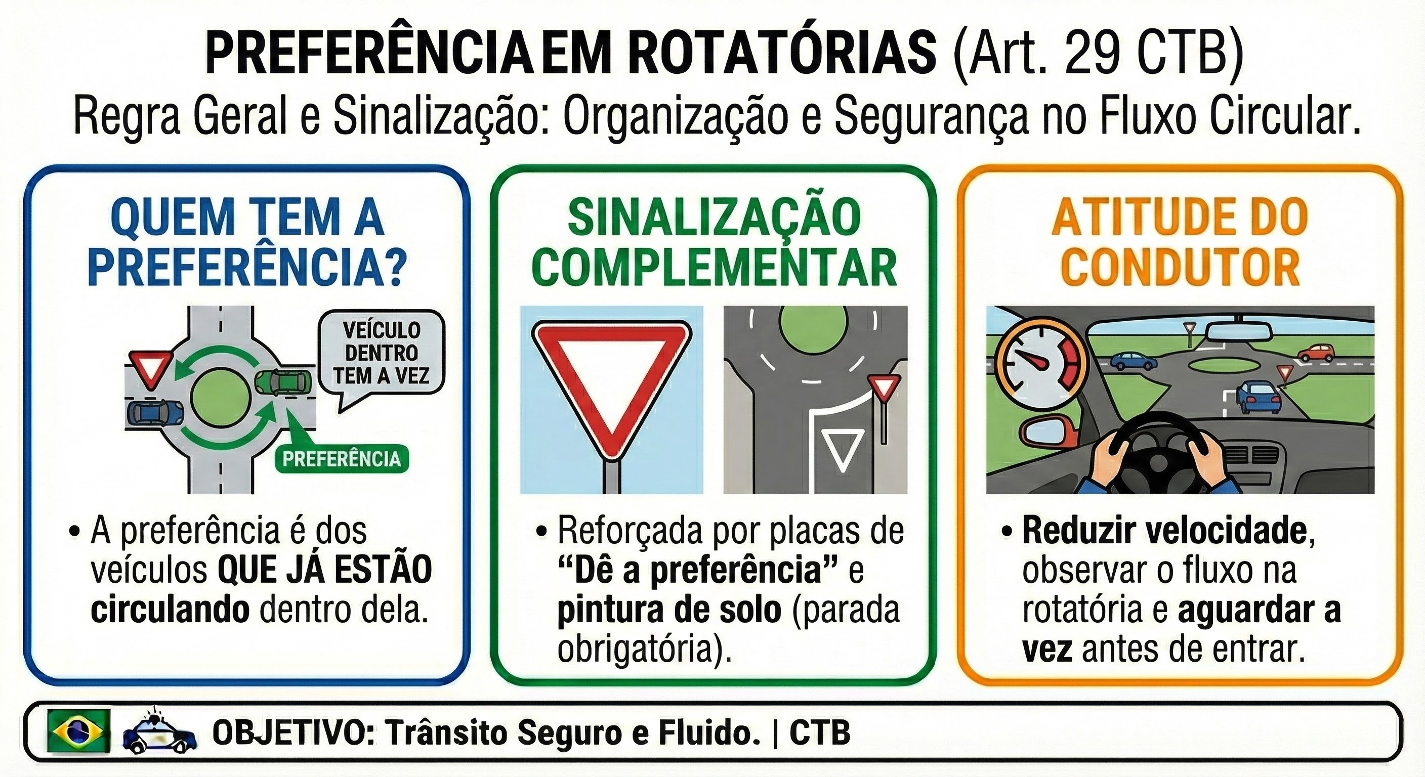 Essa regra está prevista no CTB e é complementada pela sinalização presente no local, como placas de "Dê a preferência" e pintura de solo indicando o local de parada obrigatória antes de acessar a rotatória.