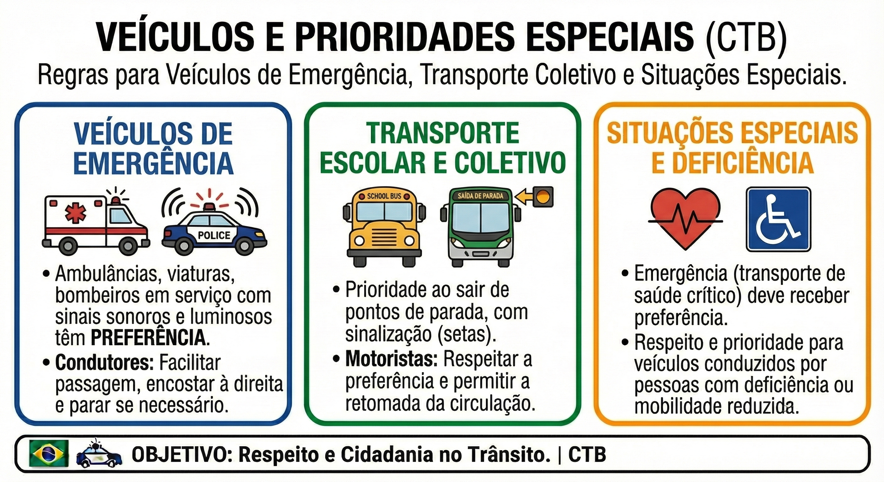 A prioridade no trânsito é um dos pilares do CTB. Veículos de emergência, como ambulâncias e bombeiros, têm preferência absoluta quando em serviço.