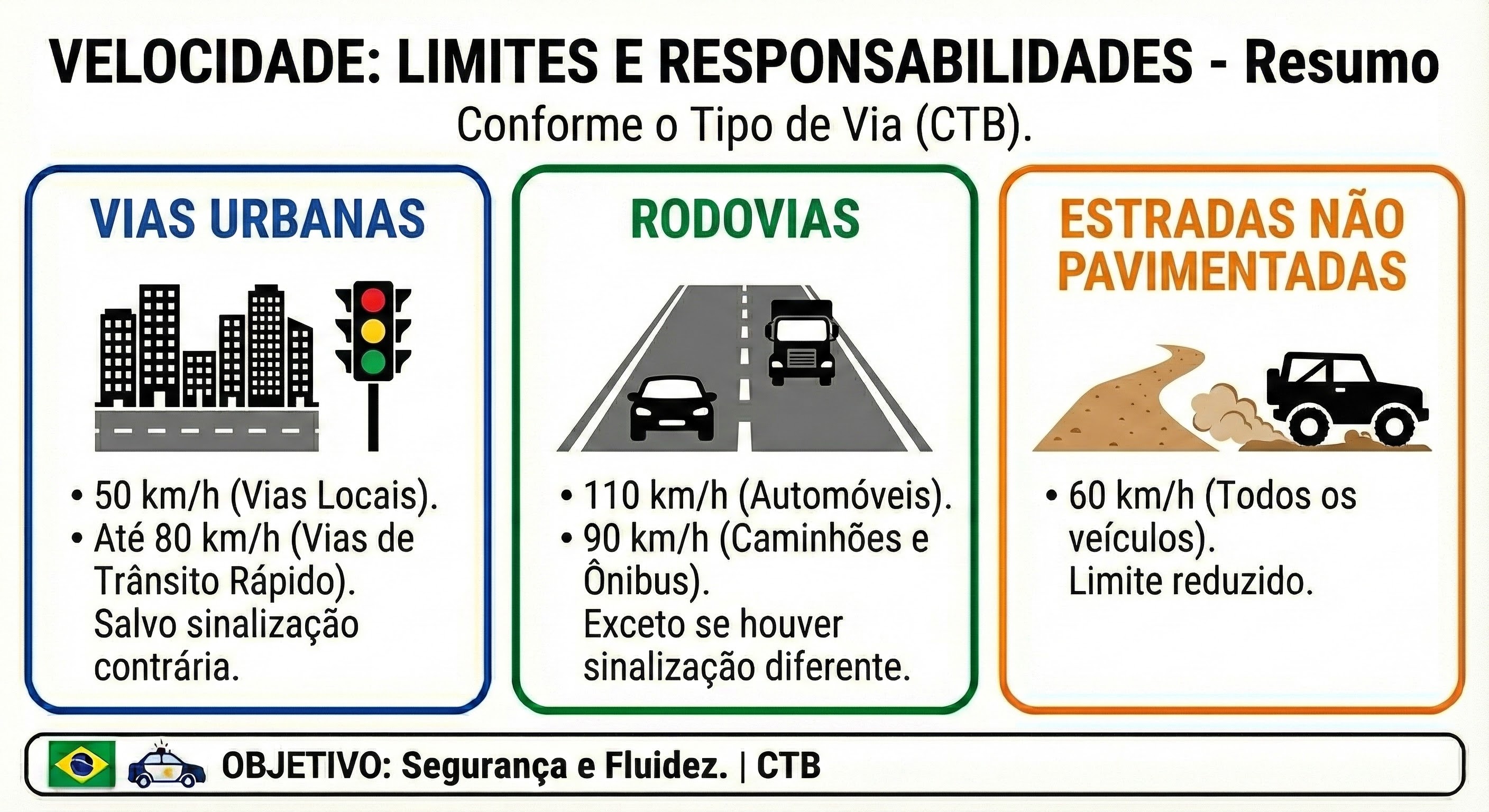 - Rodovias: 110 km/h para automóveis, 90 km/h para caminhões e ônibus, exceto se houver sinalização diferente.