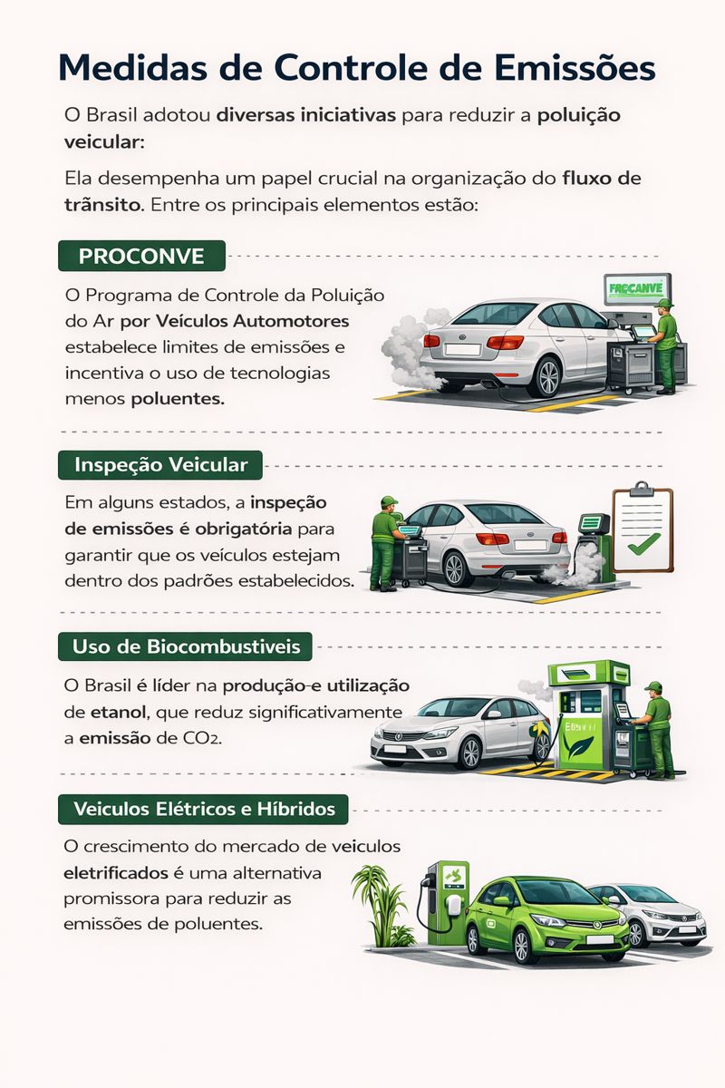 - PROCONVE: O Programa de Controle da Poluição do Ar por Veículos Automotores estabelece limites de emissões e incentiva o uso de tecnologias menos poluentes.