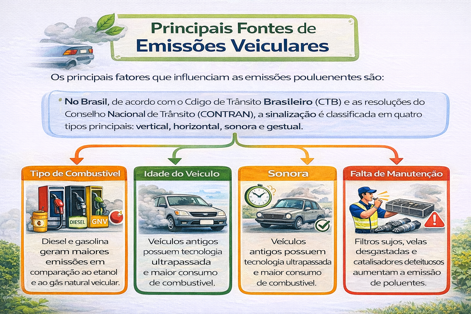 - Tipo de Combustível: Diesel e gasolina geram maiores emissões em comparação ao etanol e ao gás natural veicular (GNV).