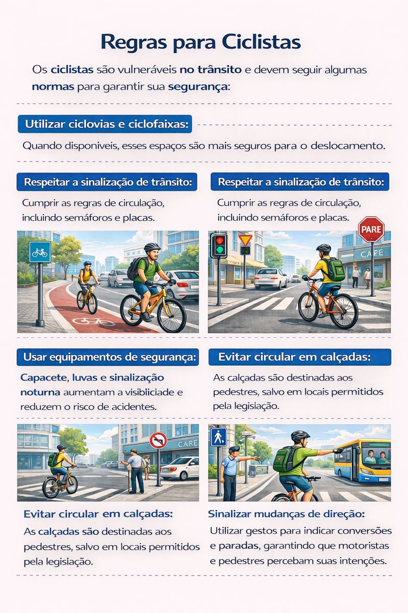 - Utilizar ciclovias e ciclofaixas: Quando disponíveis, esses espaços são mais seguros para o deslocamento.