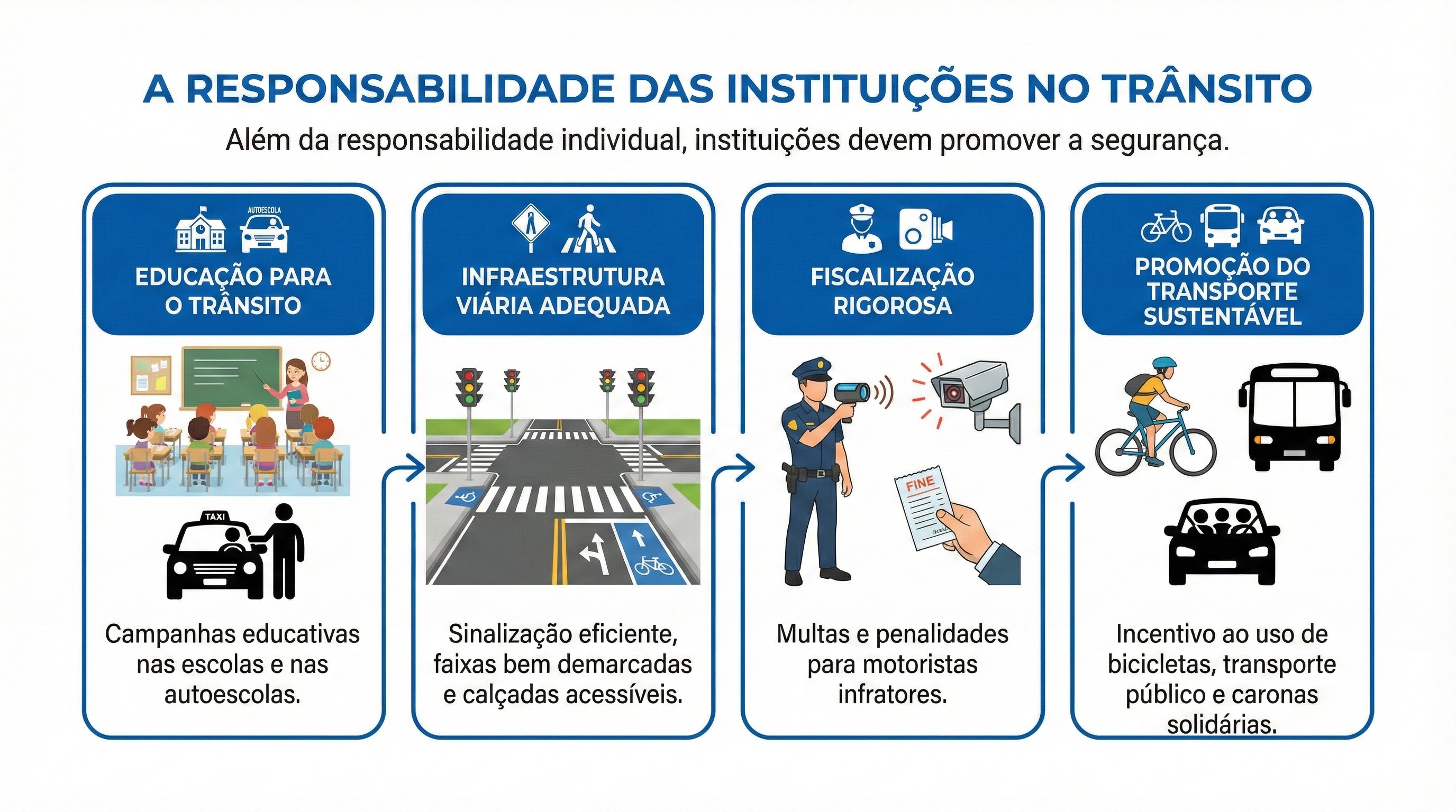 - Infraestrutura adequada: A construção de ciclovias, faixas de pedestres e sinalização eficiente reduz acidentes.