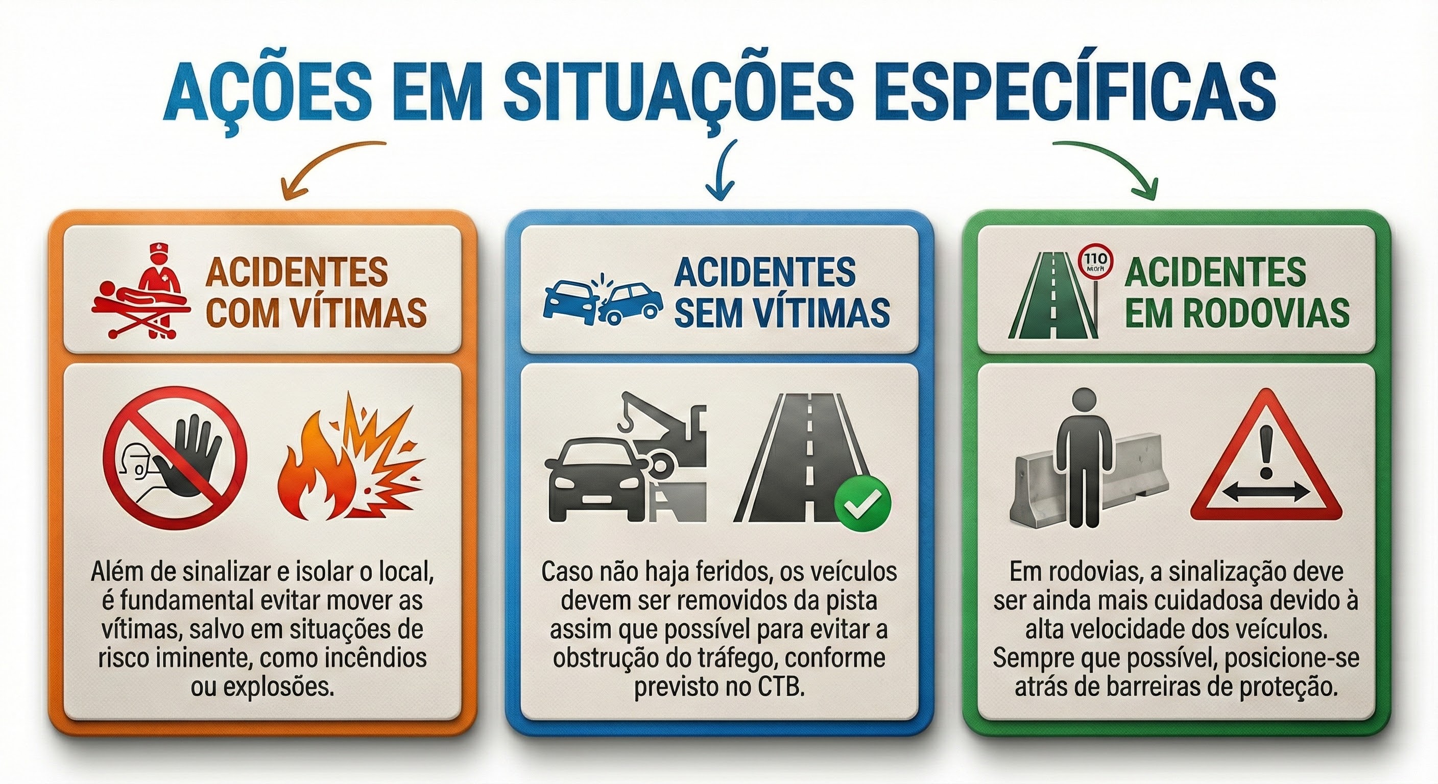 - Acidentes com Vítimas: Além de sinalizar e isolar o local, é fundamental evitar mover as vítimas, salvo em situações de risco iminente, como incêndios ou explosões.
