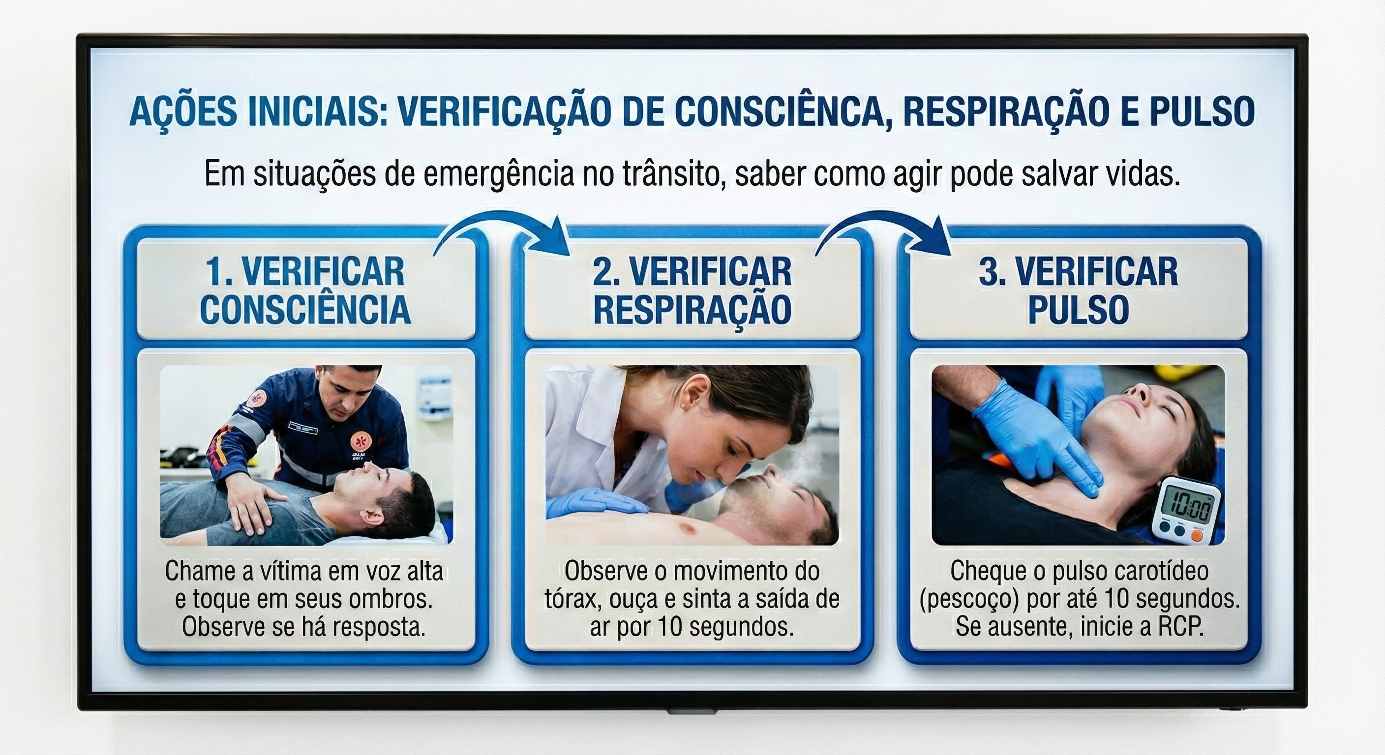 As ações iniciais servem para identificar rapidamente o estado da pessoa e priorizar os cuidados até a chegada de profissionais de emergência.