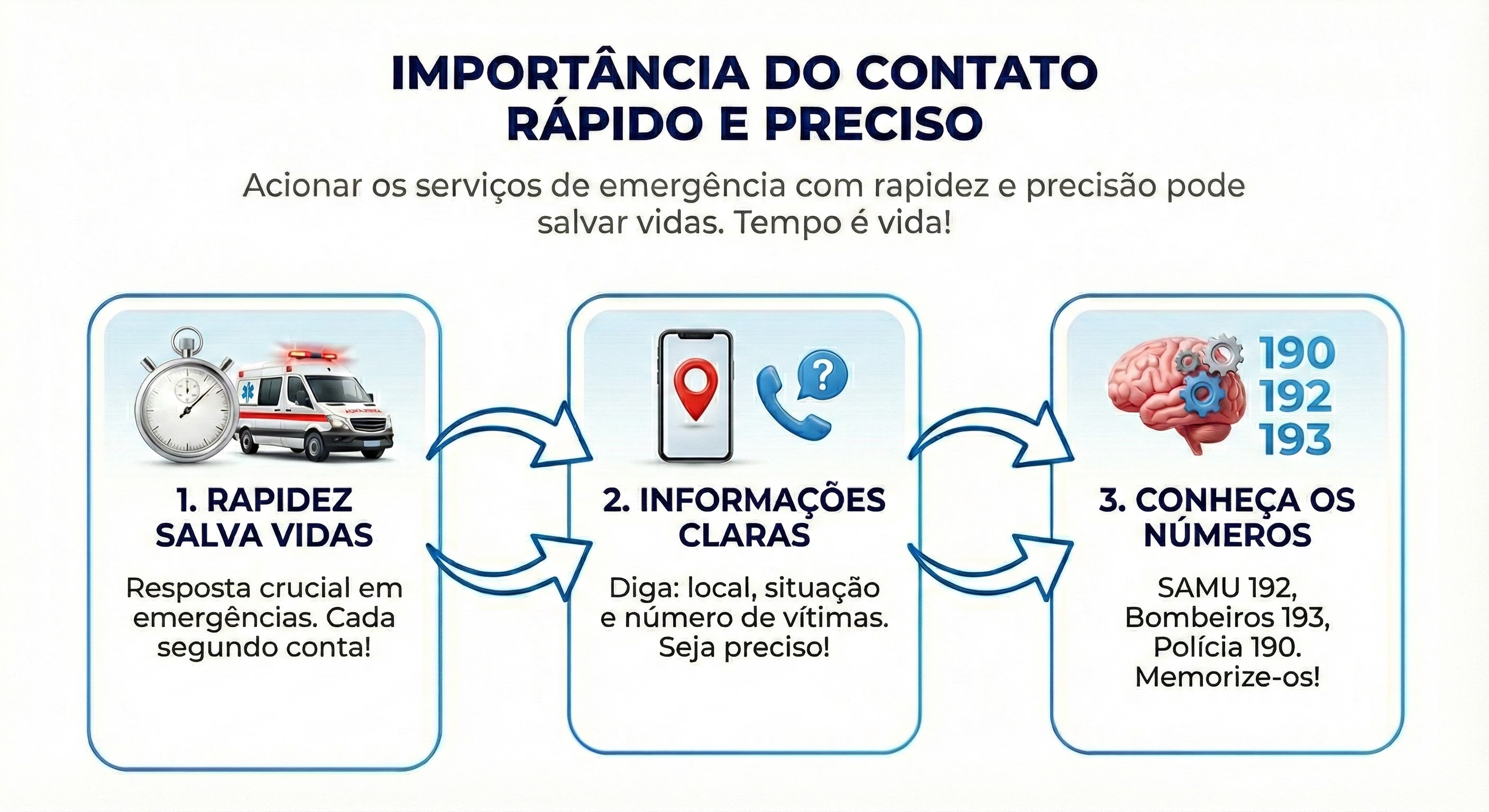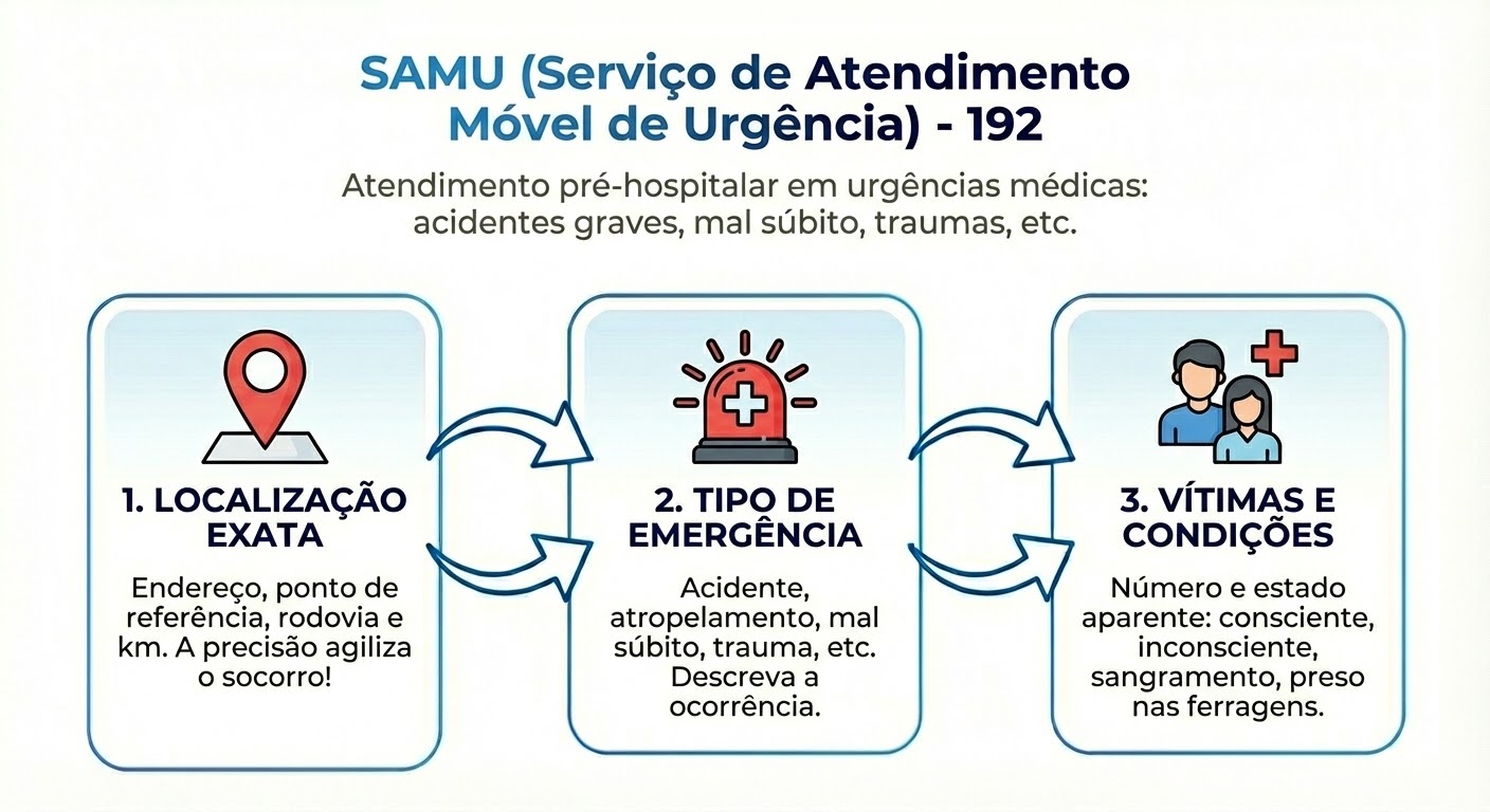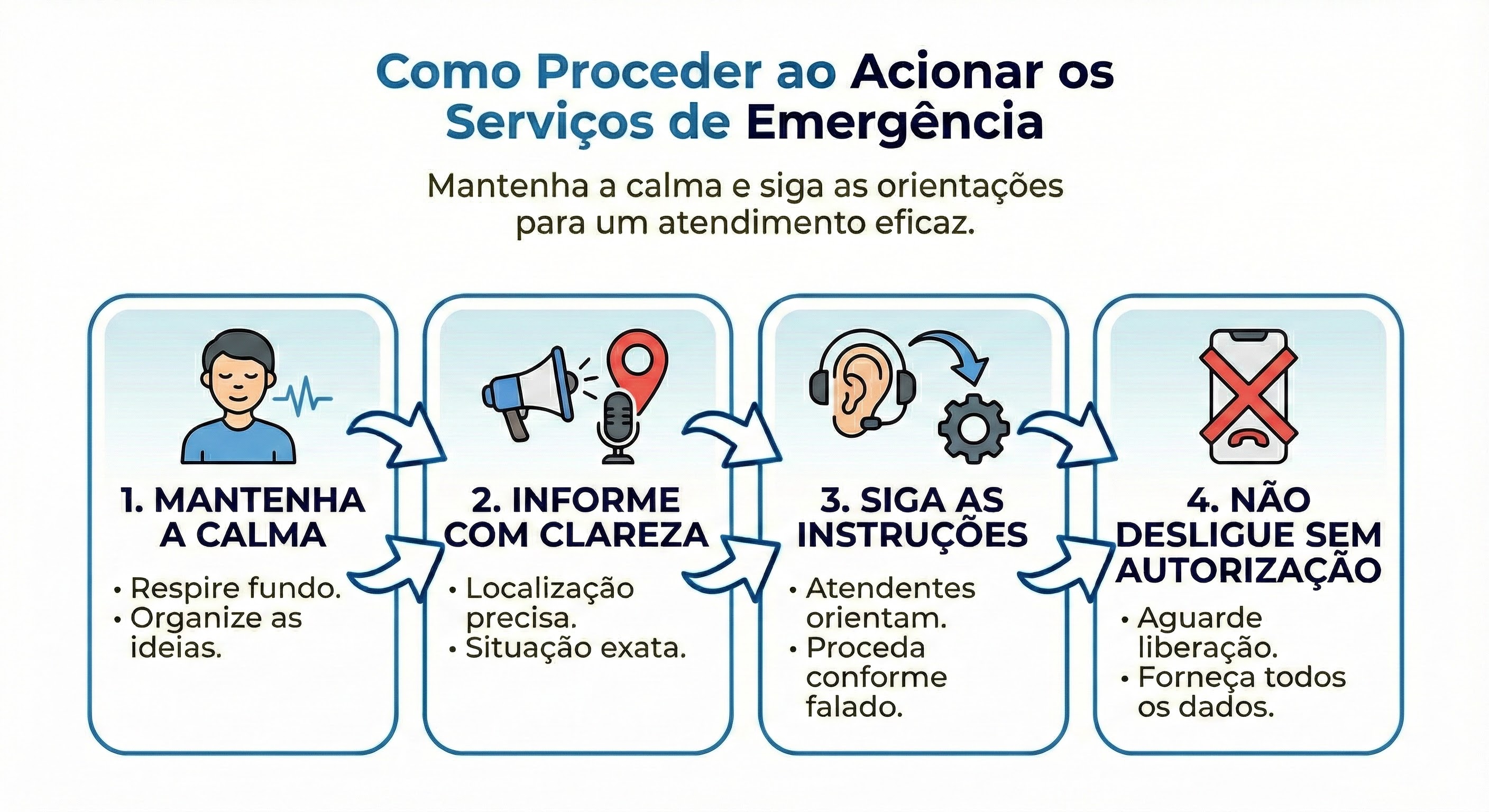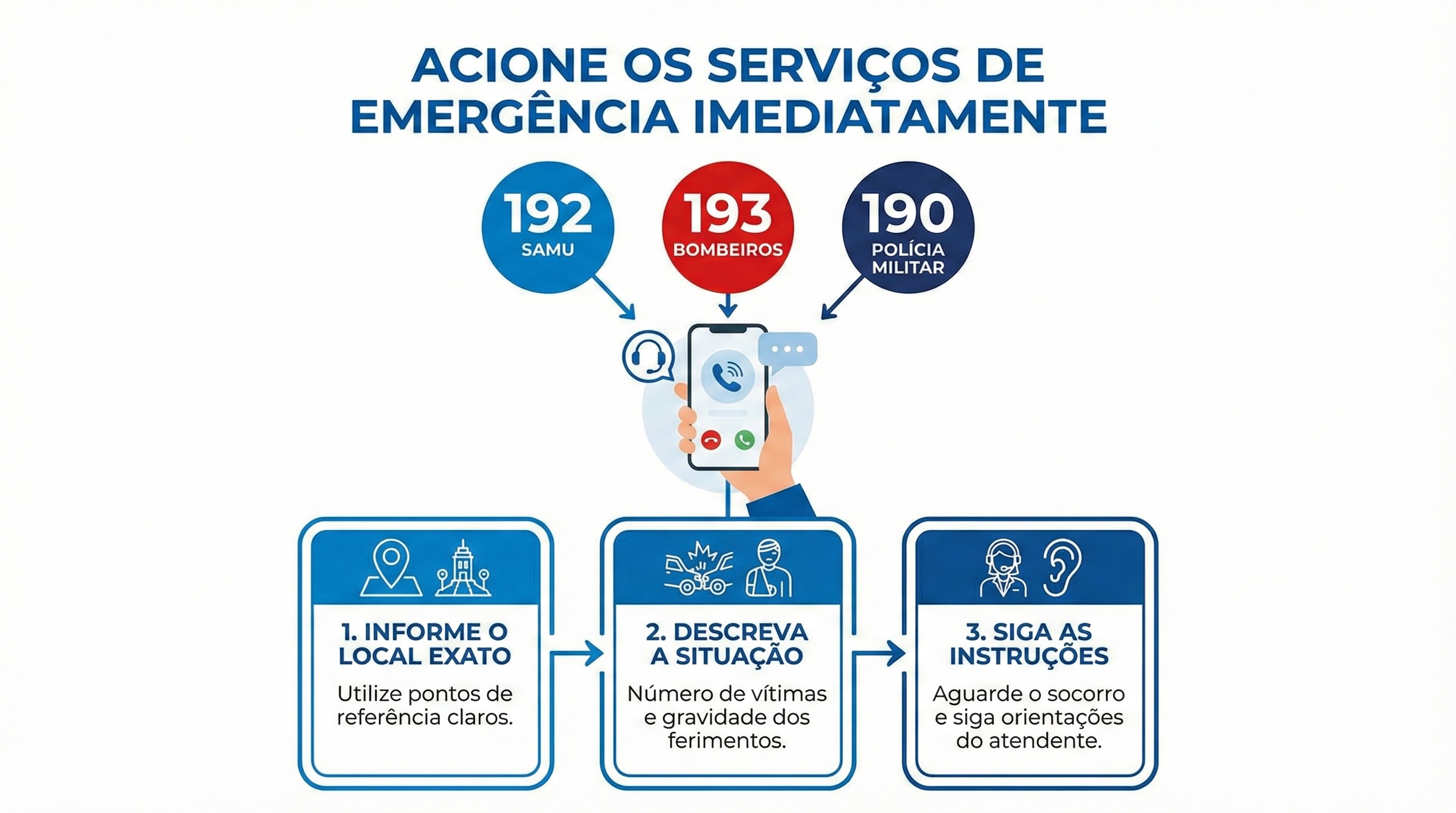Contate os serviços de emergência imediatamente através do 192 (SAMU), 193 (Corpo de Bombeiros) ou 190 (Polícia Militar). Ao fazer a chamada: