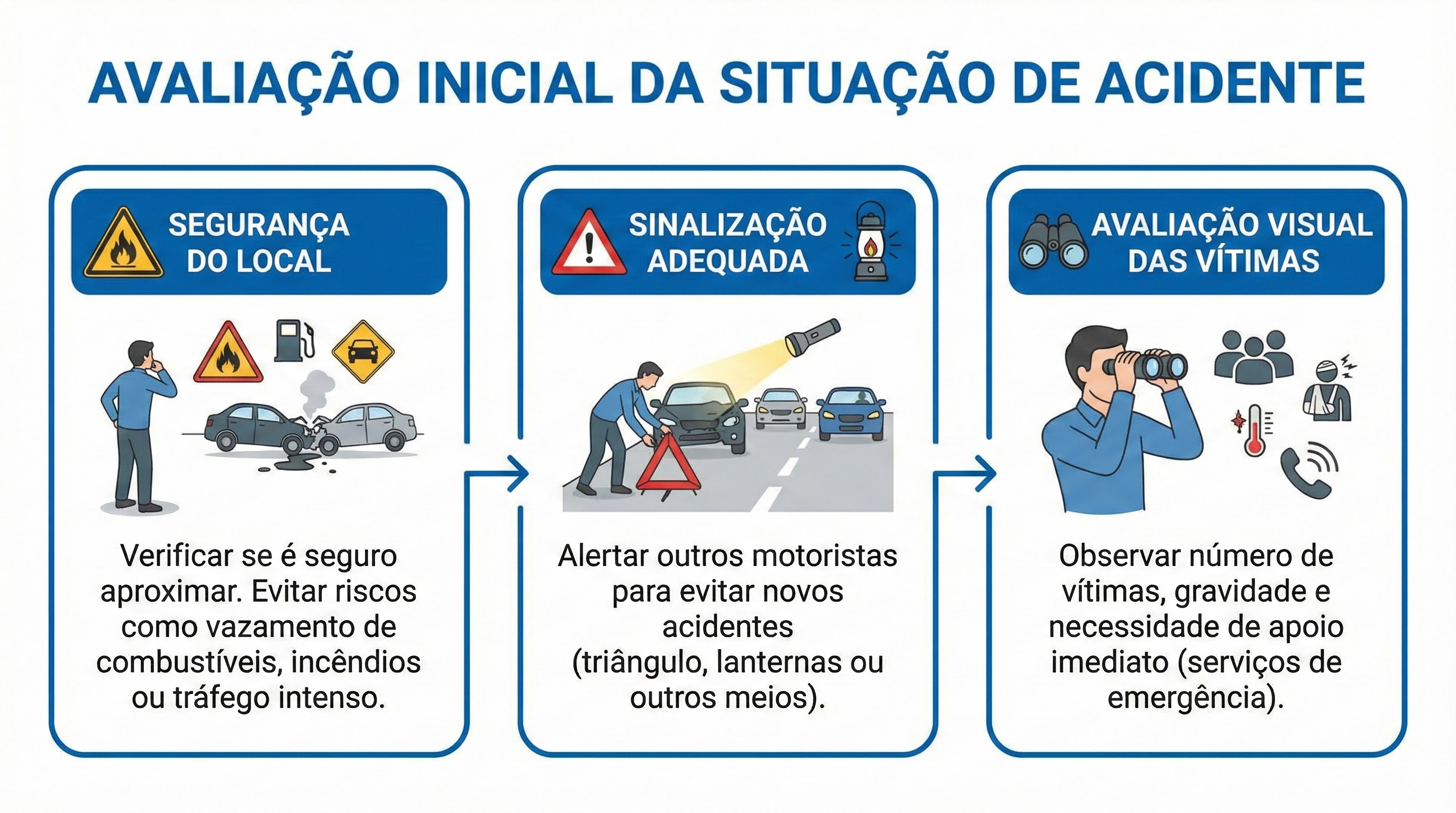 Antes de qualquer intervenção, é crucial avaliar a cena do acidente: