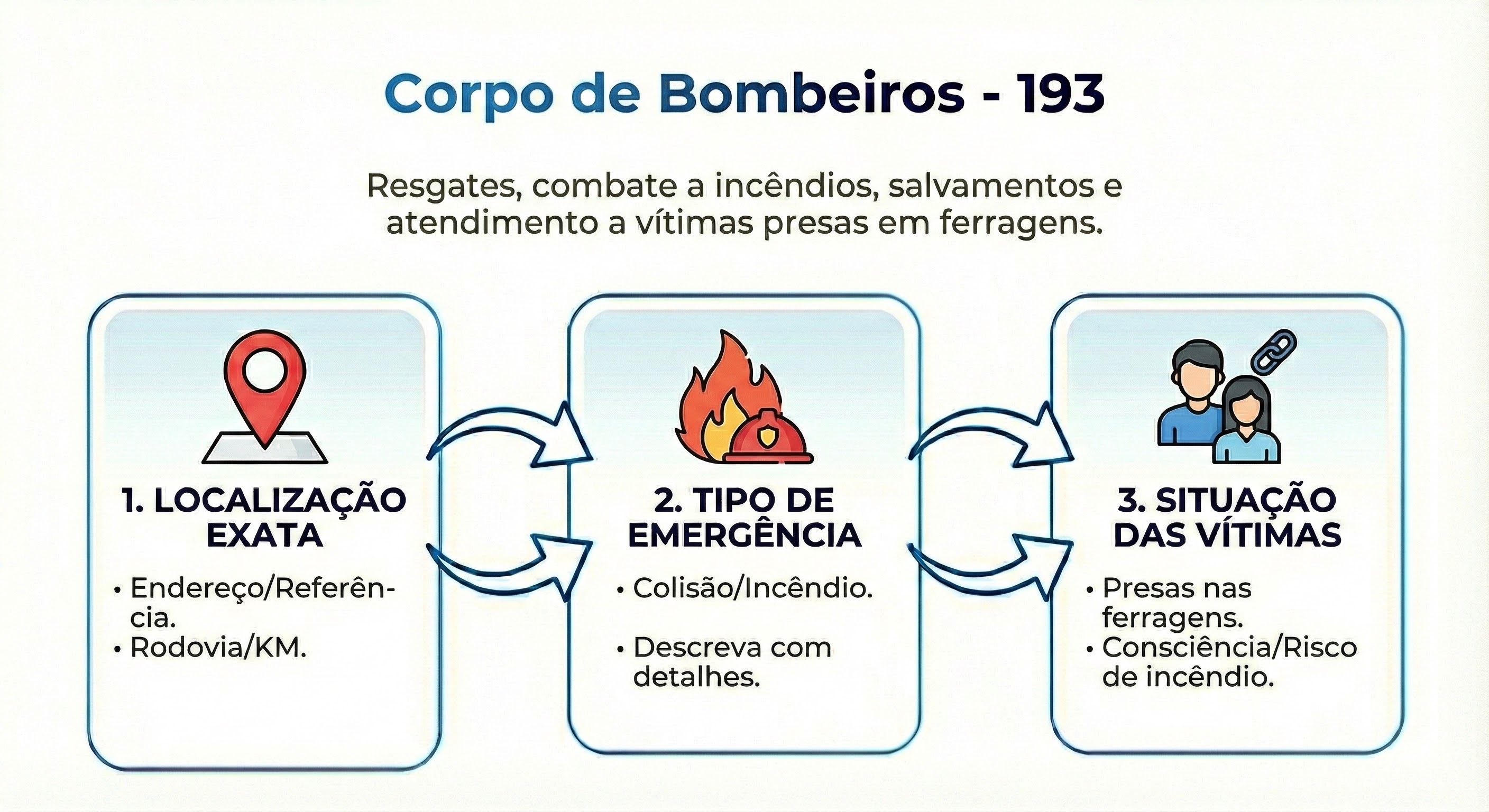 Em situações de acidente de trânsito, especialmente com risco de incêndio ou pessoas presas no veículo, é fundamental acionar os bombeiros imediatamente. Durante a ligação, forneça: