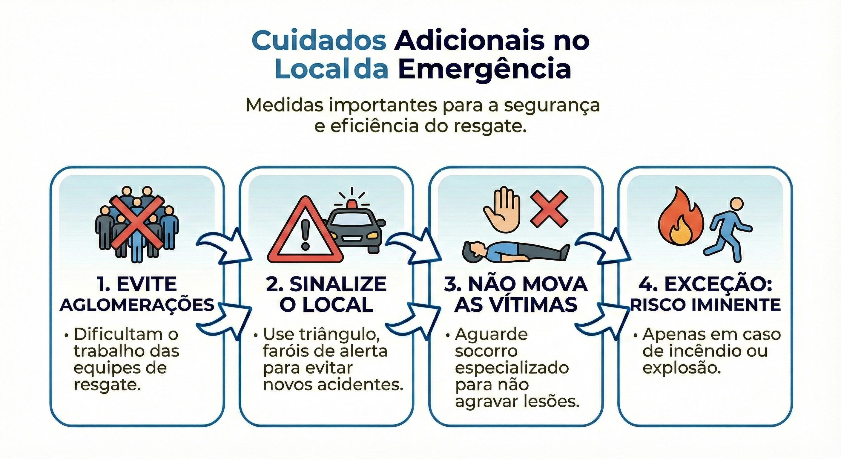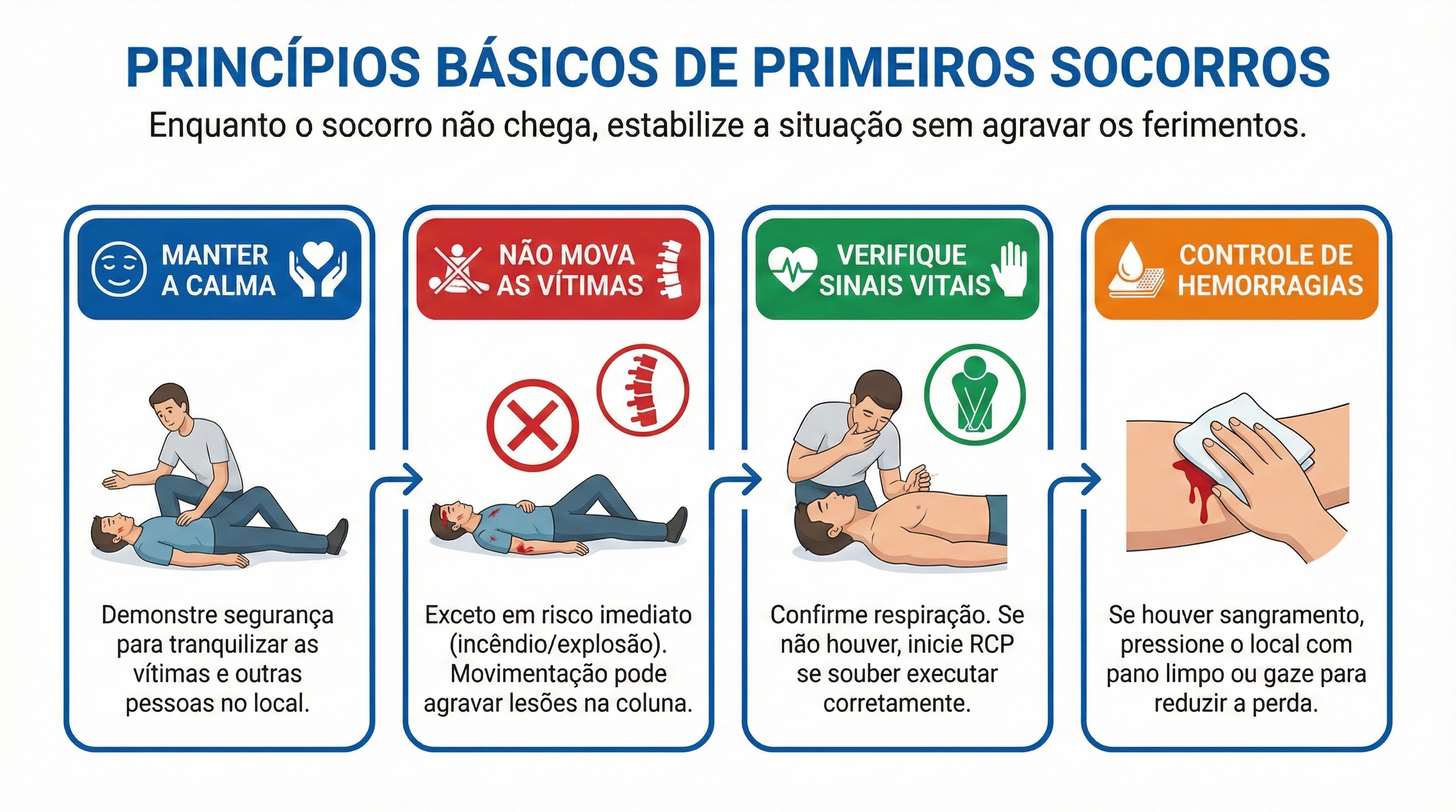 - Não mova as vítimas: A menos que haja risco iminente, como incêndio, aguarde o atendimento especializado para evitar agravamento de lesões.