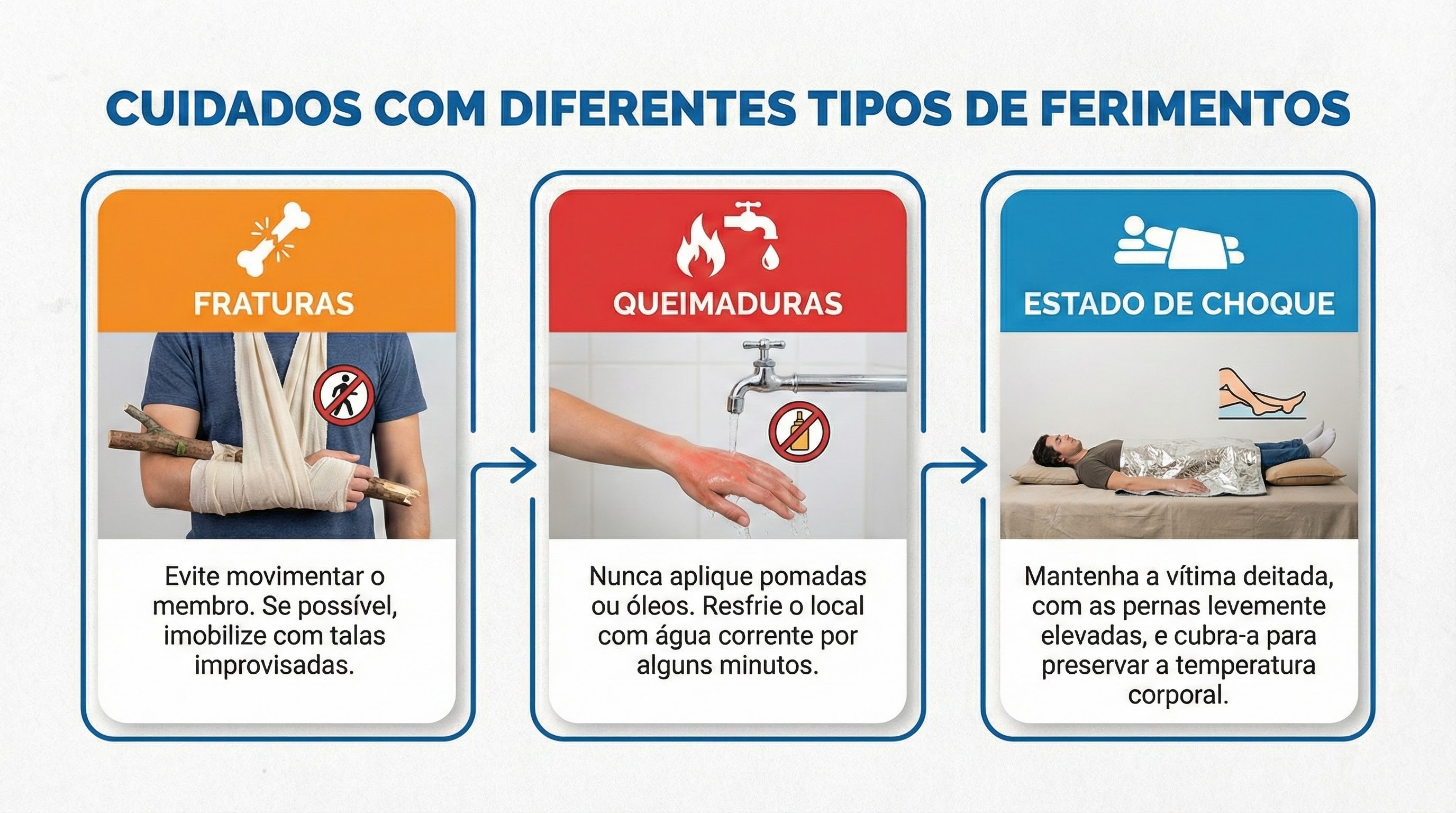 - Fraturas: Evite movimentar o membro afetado e, se possível, imobilize-o com talas improvisadas.