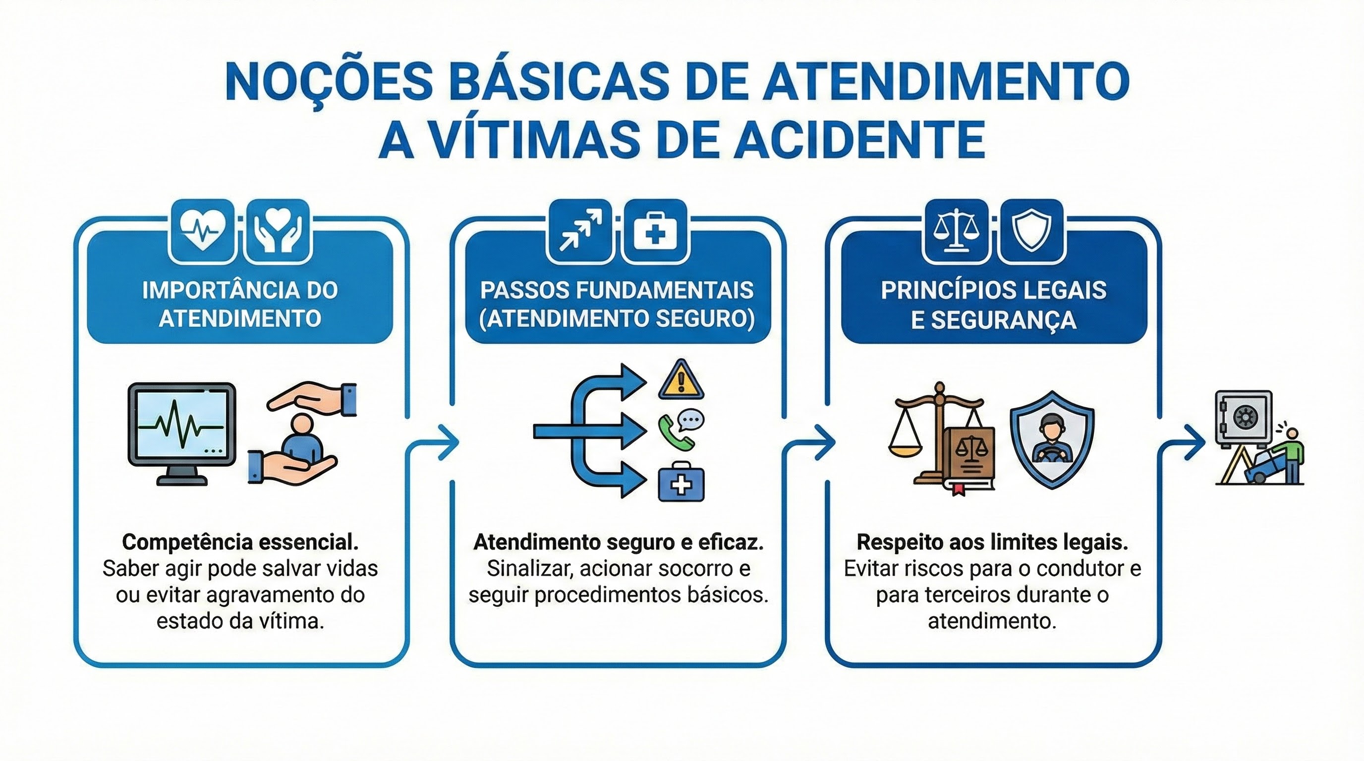 Segundo o Código de Trânsito Brasileiro (CTB), prestar socorro é uma obrigação legal dos envolvidos no acidente (art. 176). Além disso, atitudes corretas podem evitar o agravamento de lesões.