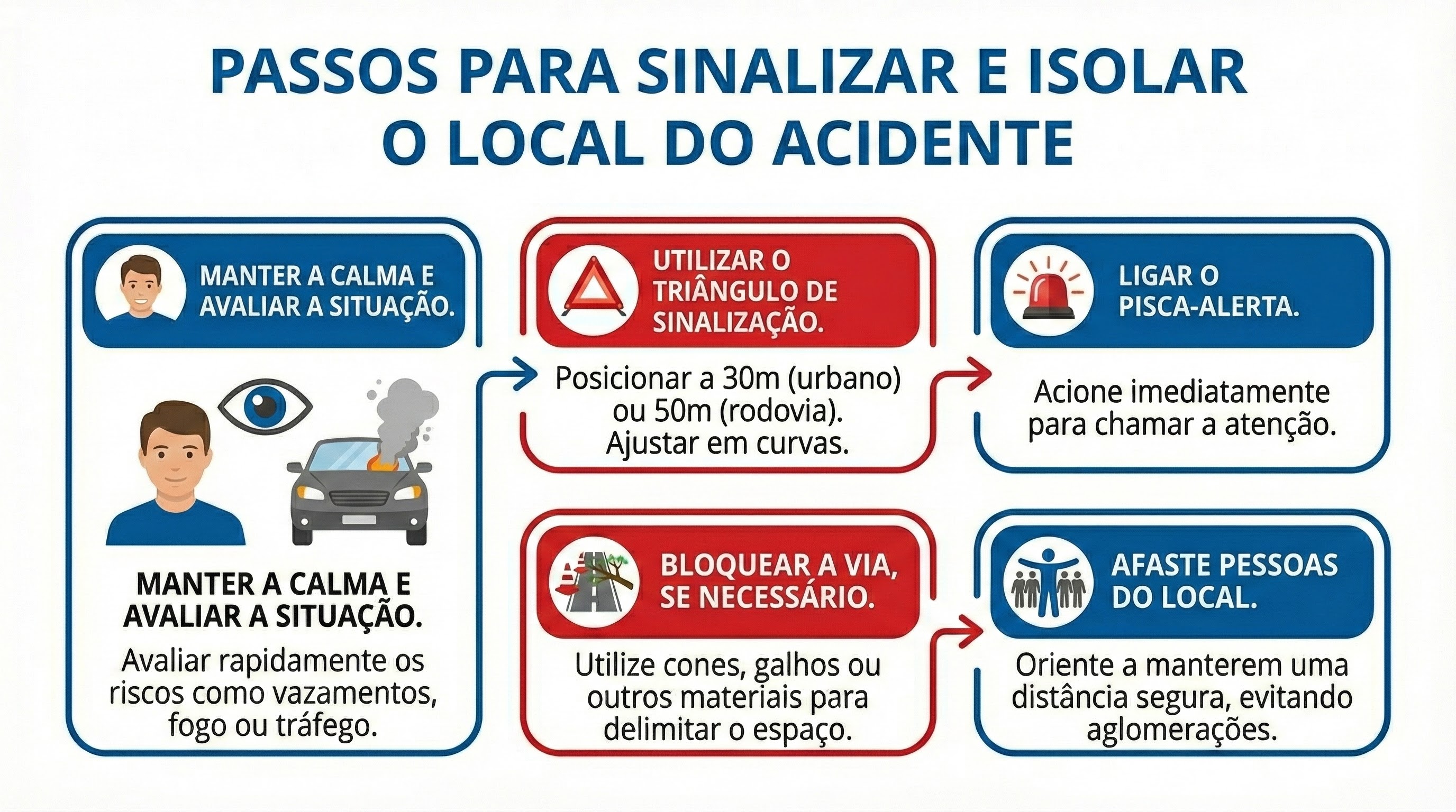 A sinalização e o isolamento do local de um acidente são etapas cruciais para garantir a segurança de todos os envolvidos e evitar novos incidentes.