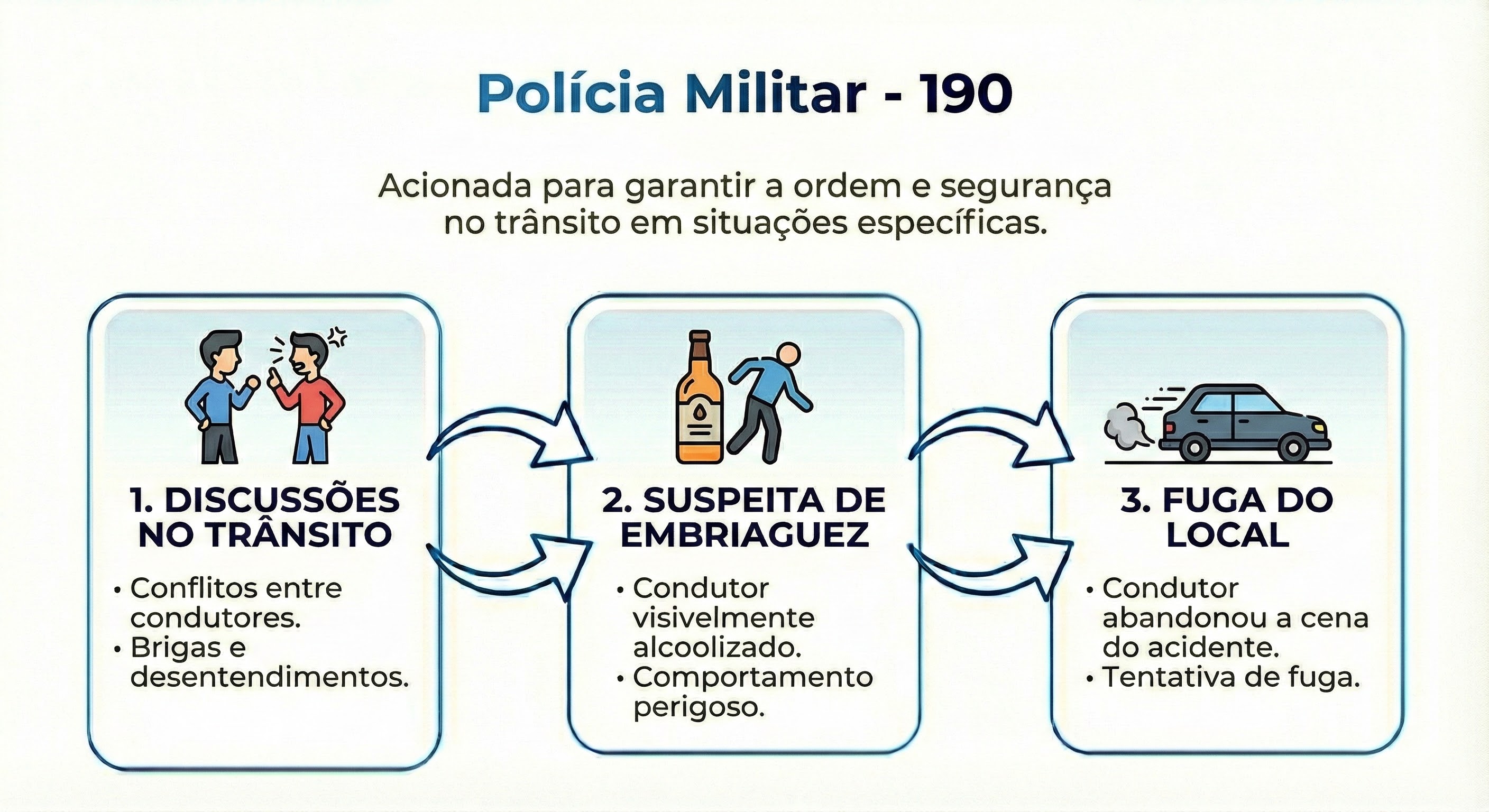 A Polícia Militar deve ser acionada em casos de acidentes com discussões entre condutores, suspeita de embriaguez, fuga do local ou qualquer situação que demande a presença de uma autoridade para assegurar a ordem e a segurança.