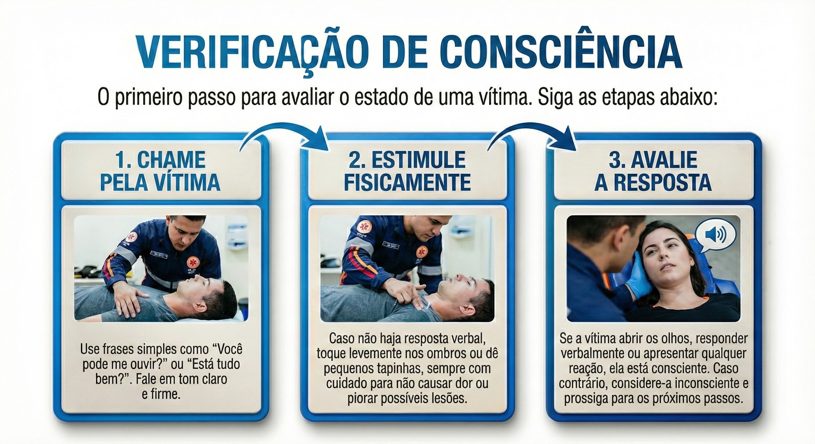 A verificação de consciência é o primeiro passo para avaliar o estado de uma vítima. Siga as etapas abaixo: