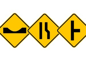 15. Analise as placas abaixo: pela ordem, advertem ao condutor da existência de: